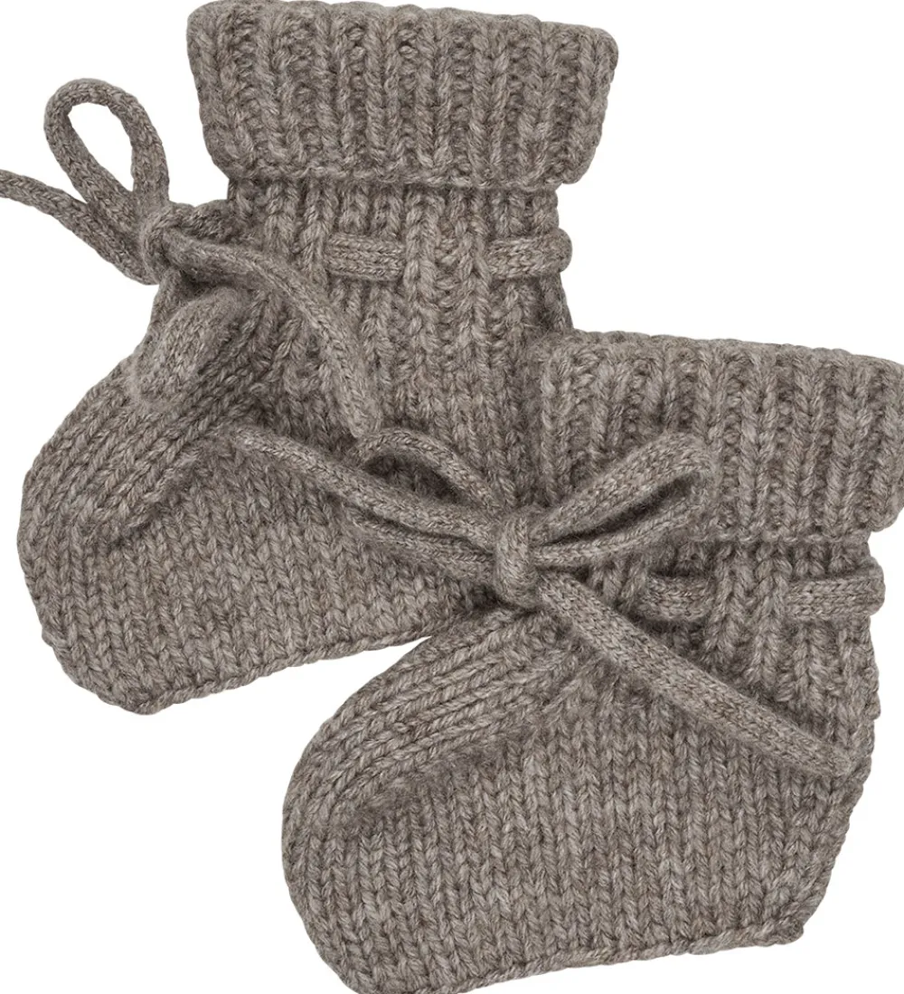 Lækre Lalaby futter i en varm brun nuance. Lalaby futterne har en bred ribkant og bindebånd, der sikrer en god pasform. Perfekte til at holde de små fødder varme og hyggelige. Futterne er lavet i en strikket kvalitet i en blanding af babyuld, yakokseuld og kashmir.