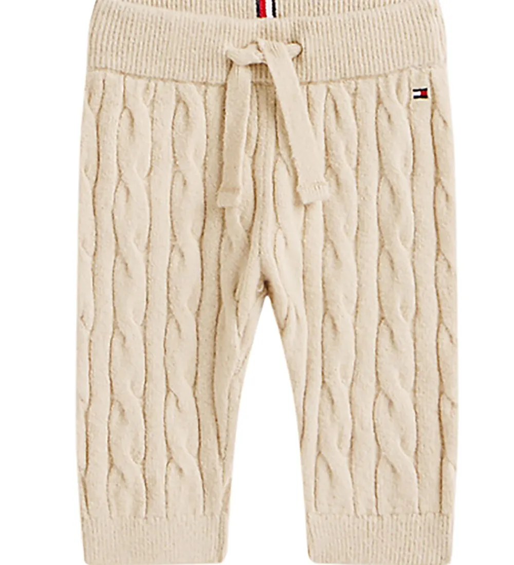 Flot Tommy Hilfiger gaveæske bestående af en hue, en cardigan og et par bukser i beige med kabelstrikket struktur. Huen har en rund hovedform med ombuk nederst. Cardiganen har en rund halsudskæring og gennemgående knapper foran. Bukserne har en bred elastik i taljen og snører foran, som giver en god pasform. Bukserne har ribkanter i benåbningerne.
