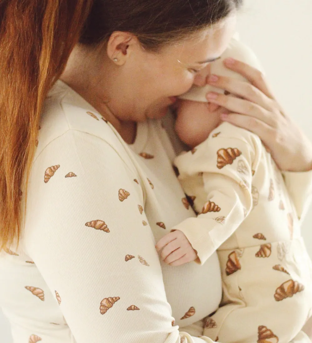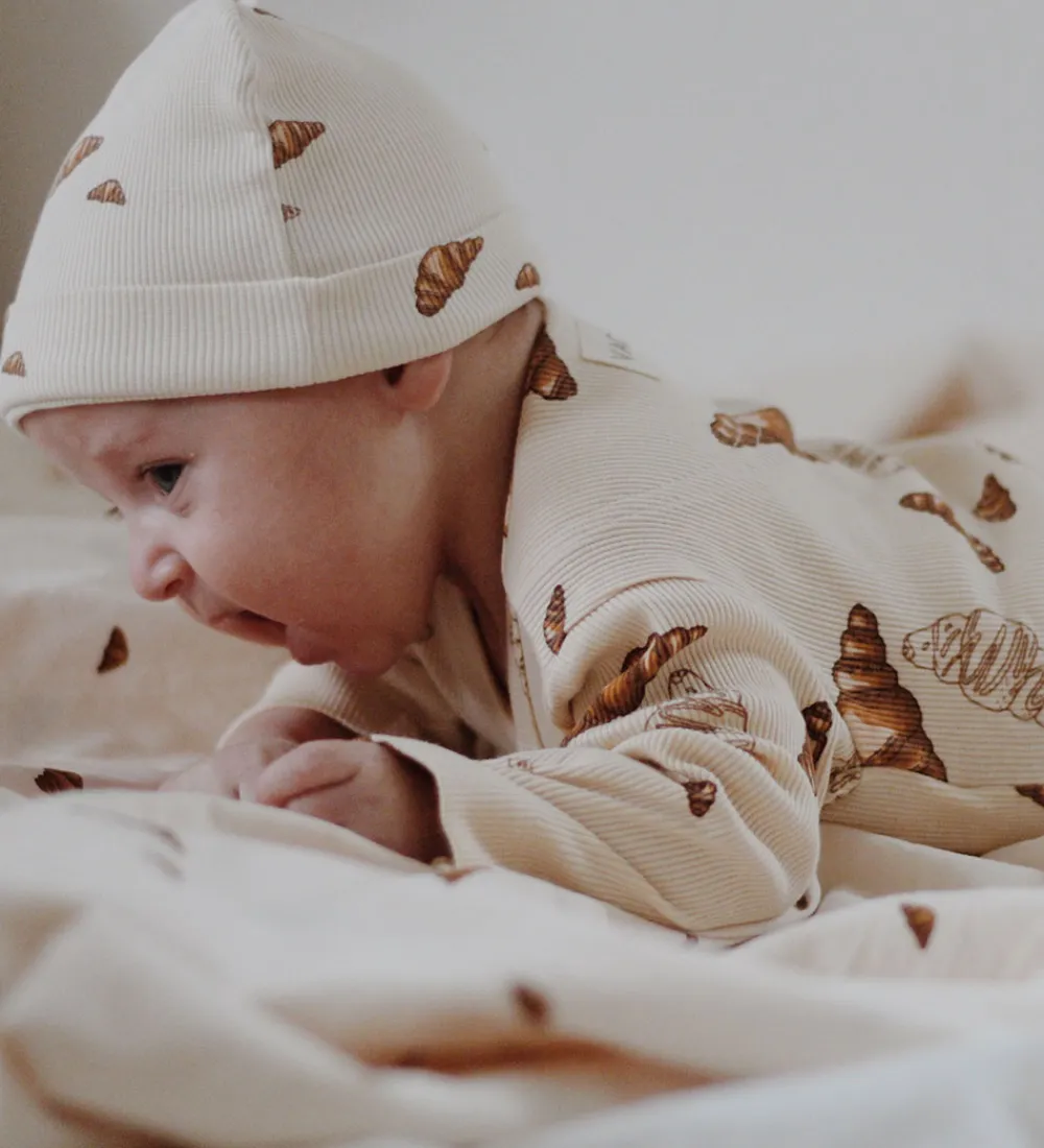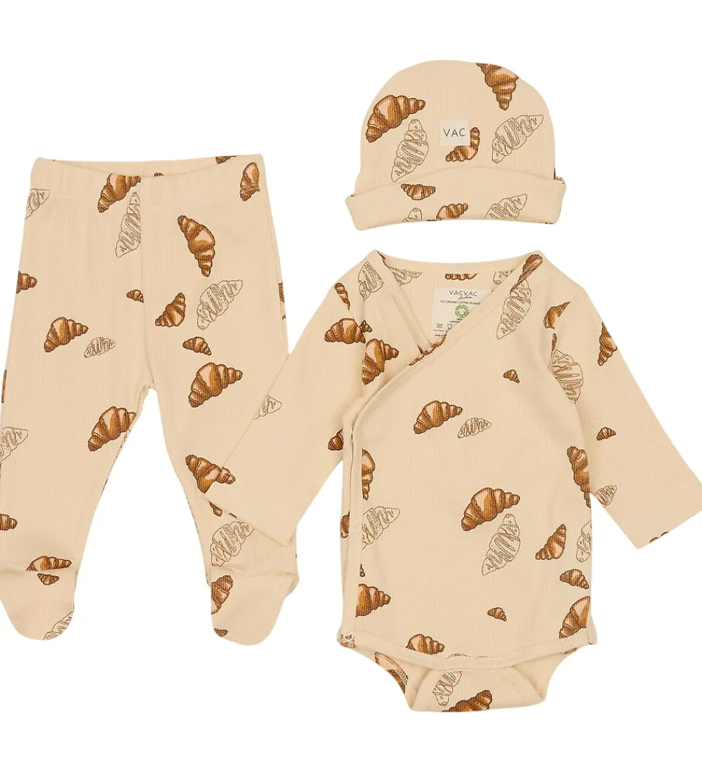 Flot VACVAC gaveæske, der indeholder en body, et par bukser og en hue i beige med et print med forskellige store croissanter i brune nuancer.