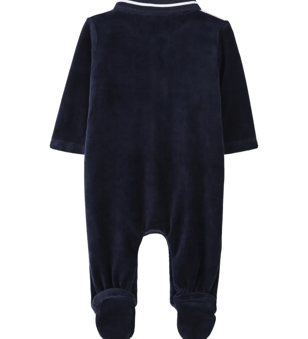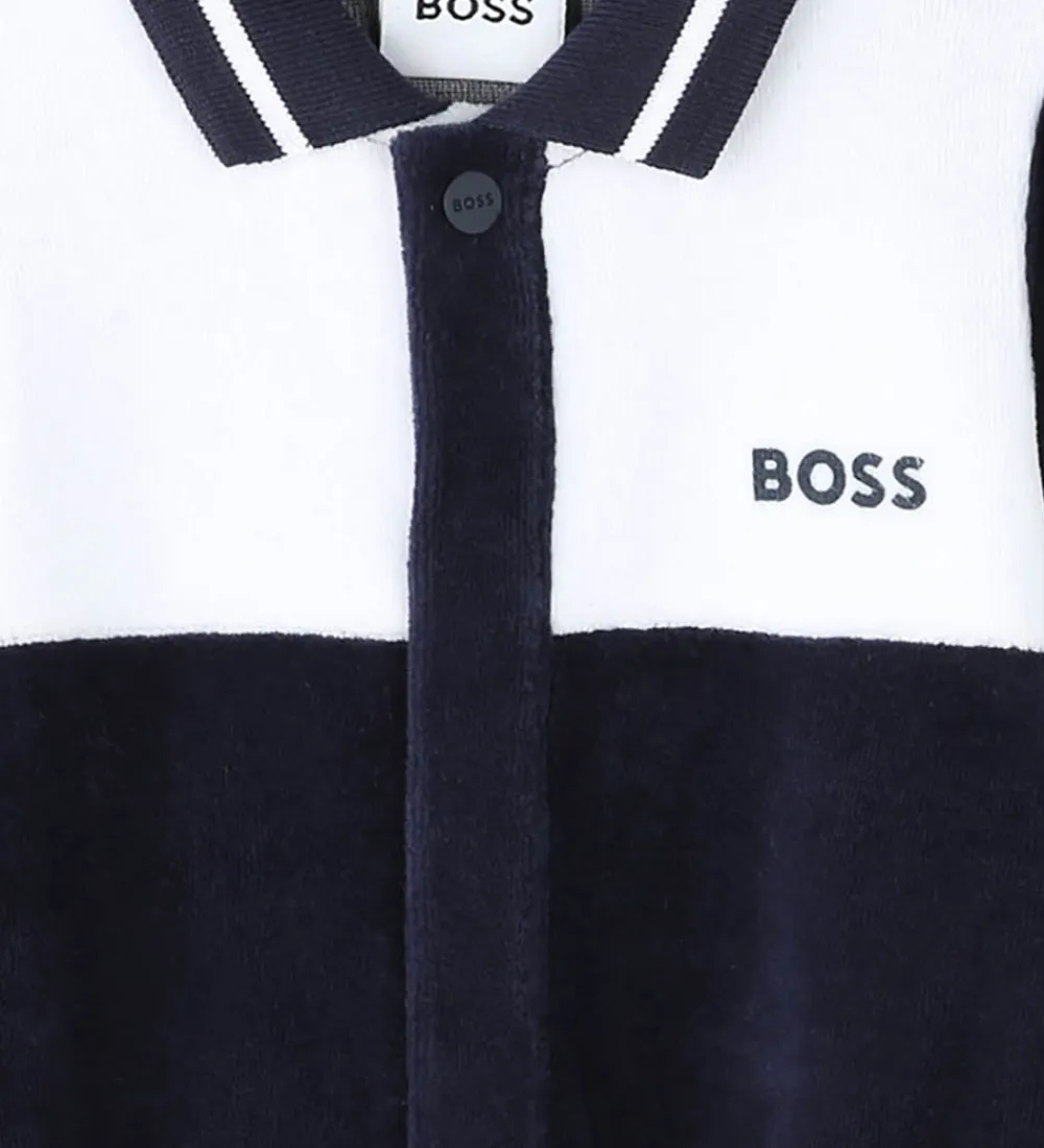 Elegant BOSS natdragt i navy velour, og øverst på fronten er den hvid. Natdragten har lange ærmer, og benene har faste fødder. I halsåbningen har natdragten en klassisk krave med ribstruktur. Natdragten åbnes ned ad fronten og ned ad begge bukseben med skjulte trykknapper.
