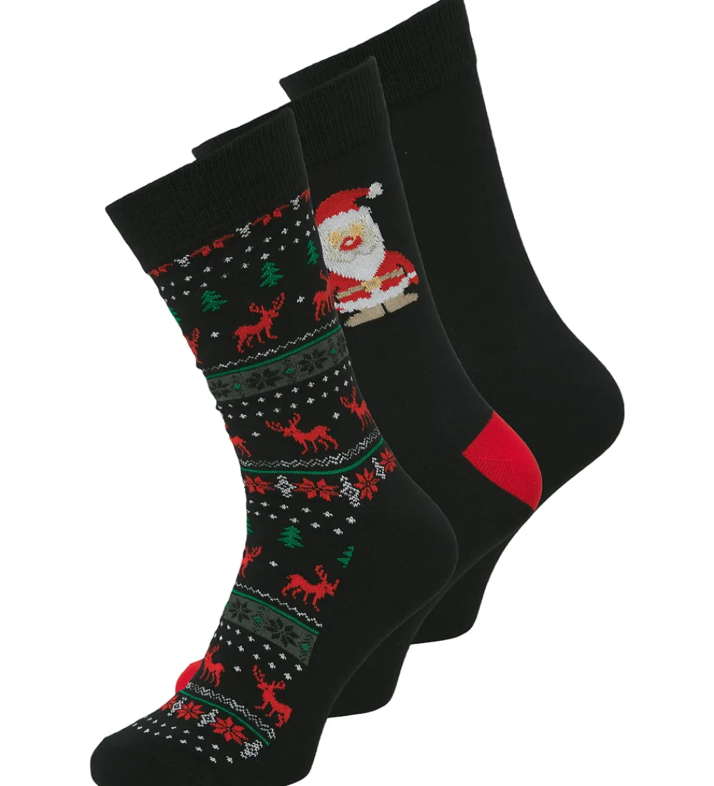 Festlig Jack & Jones gaveæske med tre strømper med forskellige julemotiver med rensdyr og juletræer i sorte, røde og grønne nuancer. Strømperne har en smal ribkant øverst på skaftet.