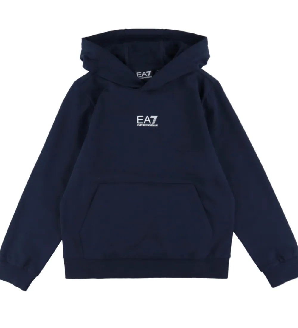 Flot EA7 hættetrøje i navy sweat, og fortil er der trykt et lille, hvidt logo.