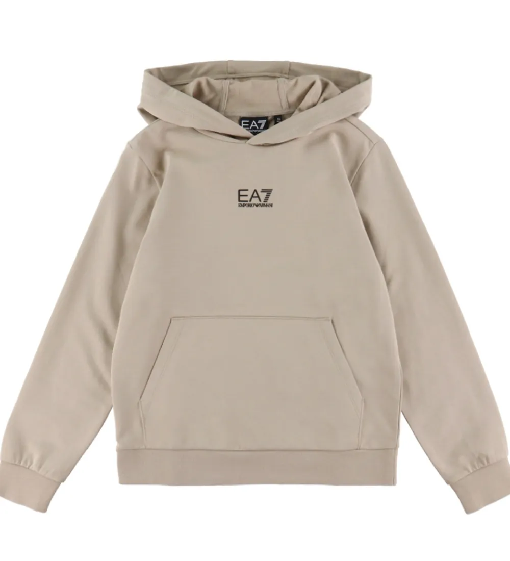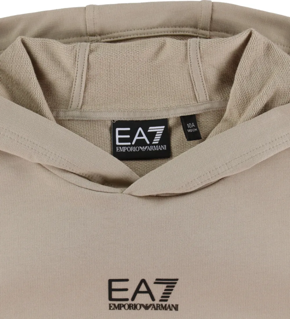 Lækker EA7 hættetrøje i beigefarvet sweat, og fortil er der trykt et lille, sort logo.