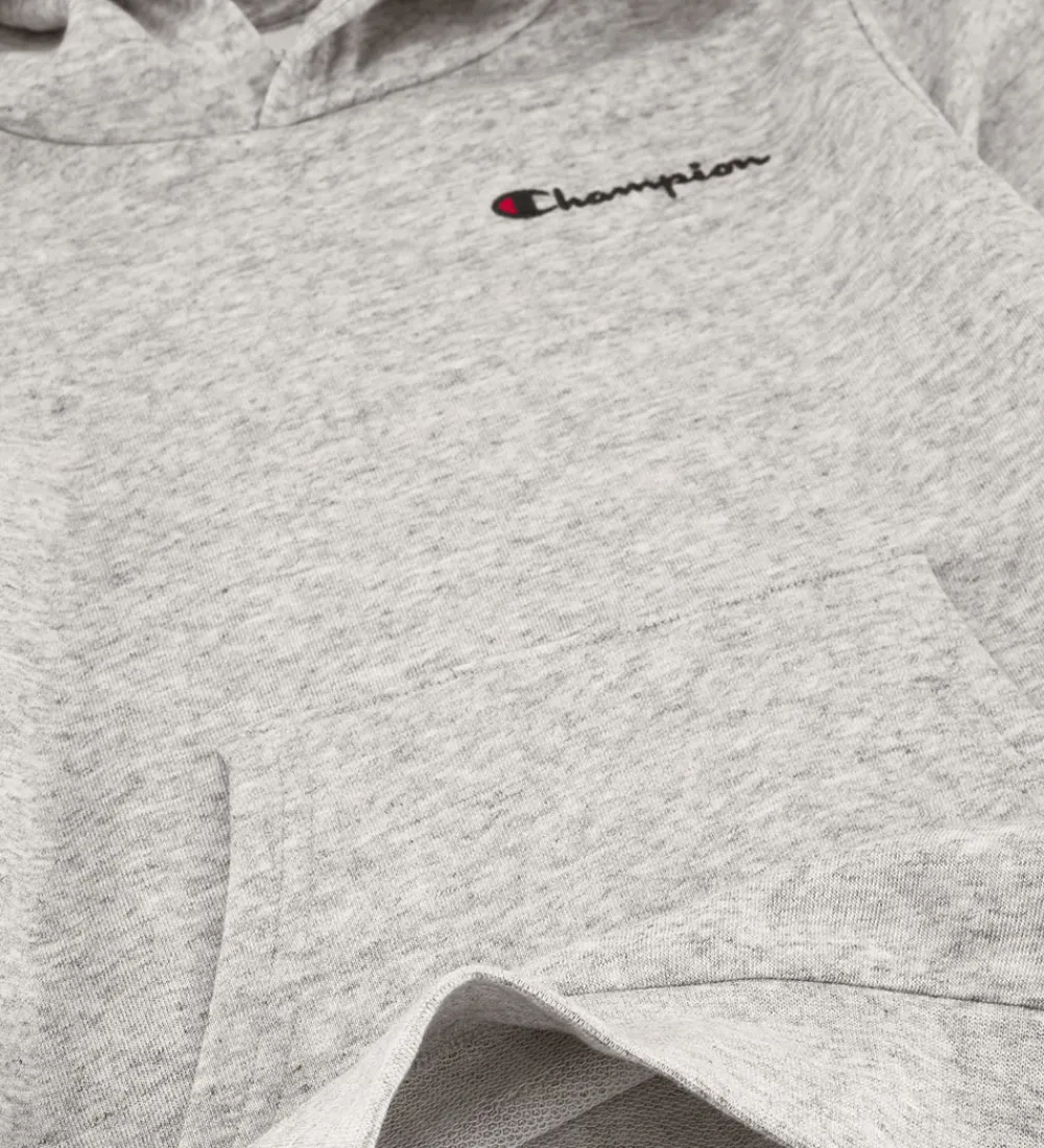 Lækker Champion Hættetrøje i grå med et klassisk logoprint på fronten i rød og blå. Hættetrøjen har lange ærmer og en praktisk kængurulomme foran.