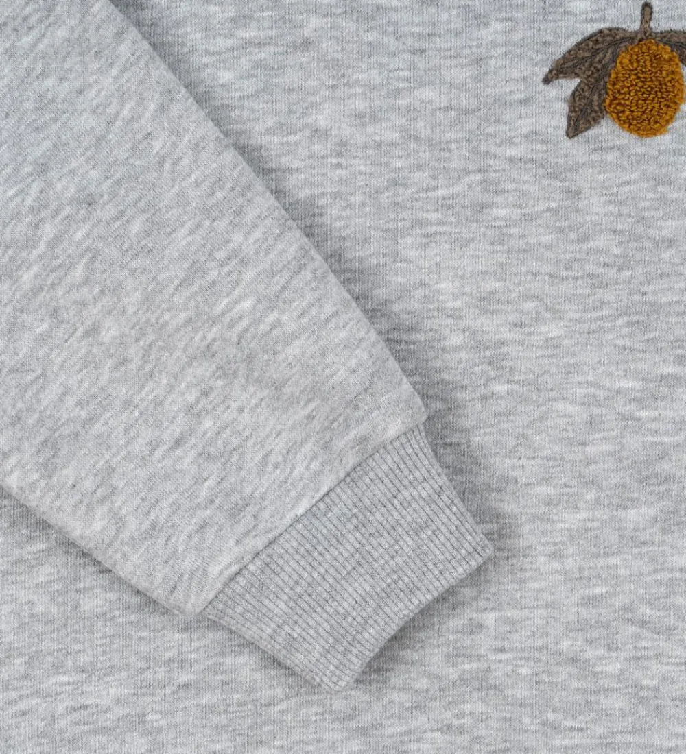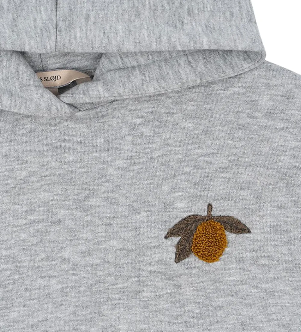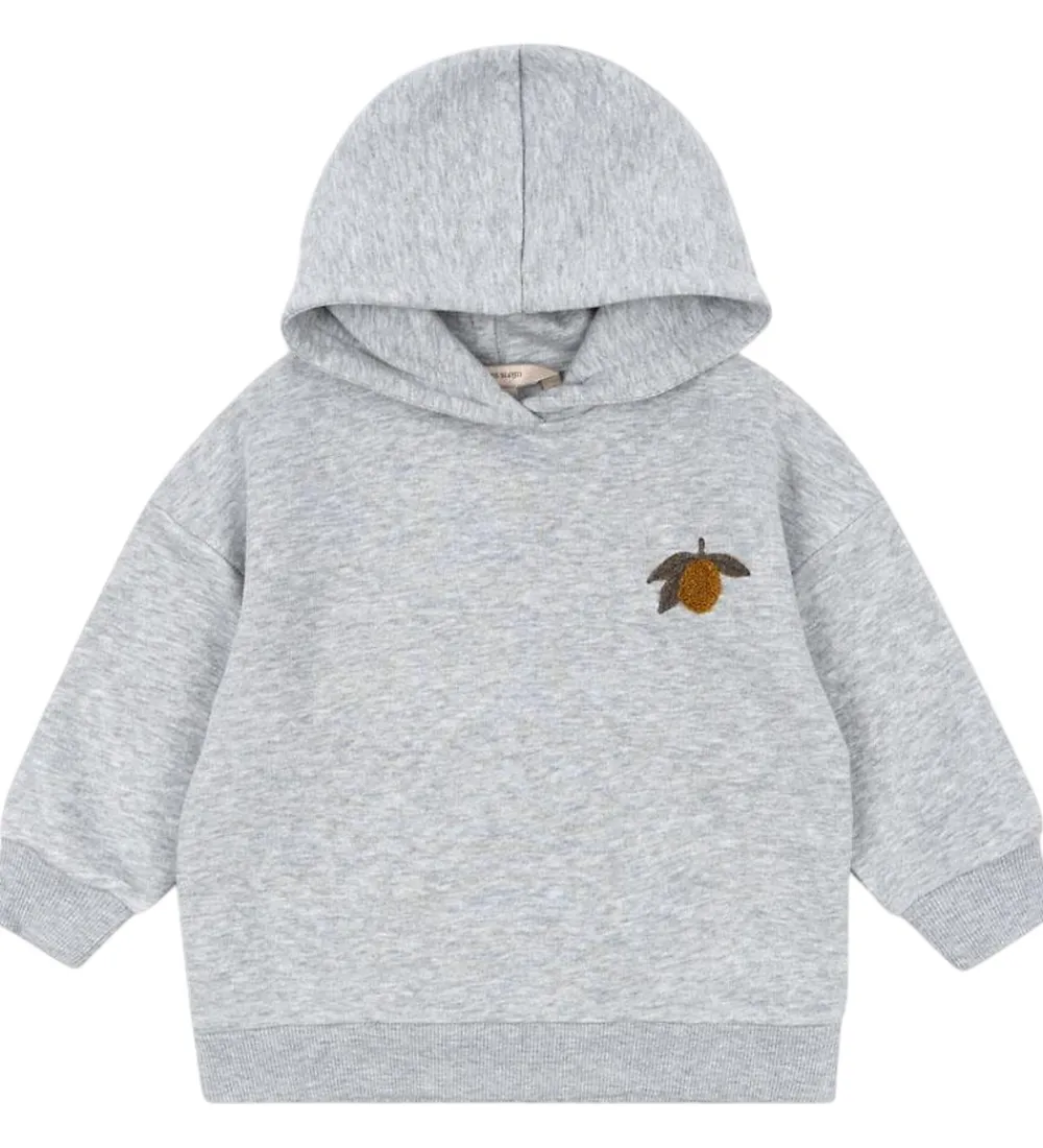 Dejlig Konges Sløjd hættetrøje i en klassisk, gråmeleret farve. Hættetrøjen har et diskret broderi af en citron på brystet. Den har elastik ved håndleddene og i bunden, hvilket giver en god pasform.