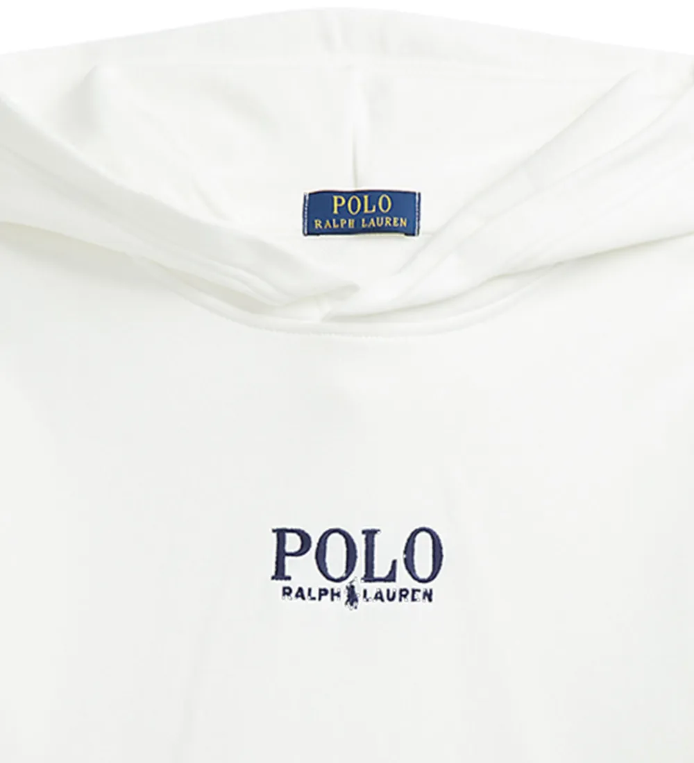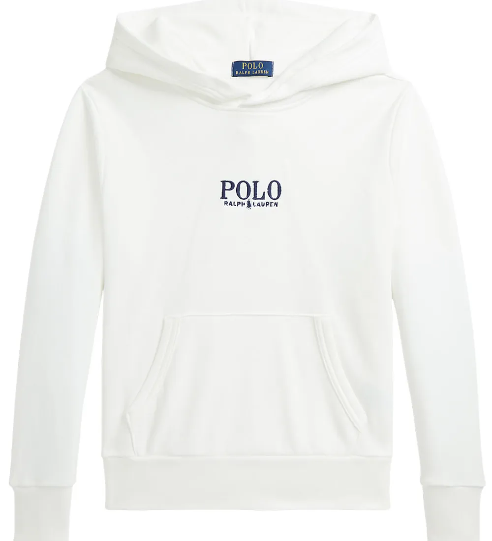 Fin Polo Ralph Lauren hættetrøje i hvid, og fortil står der “Polo Ralph Lauren” broderet i navy.