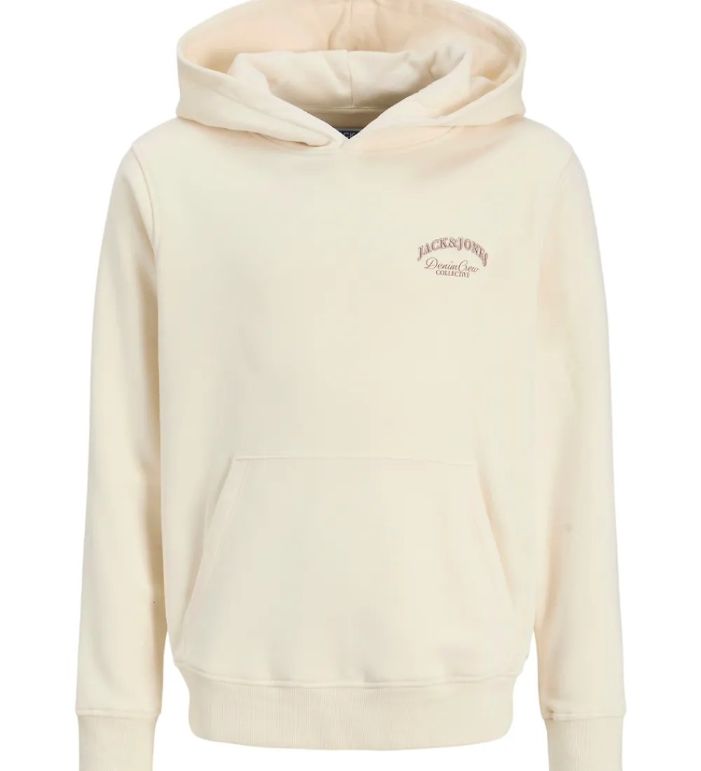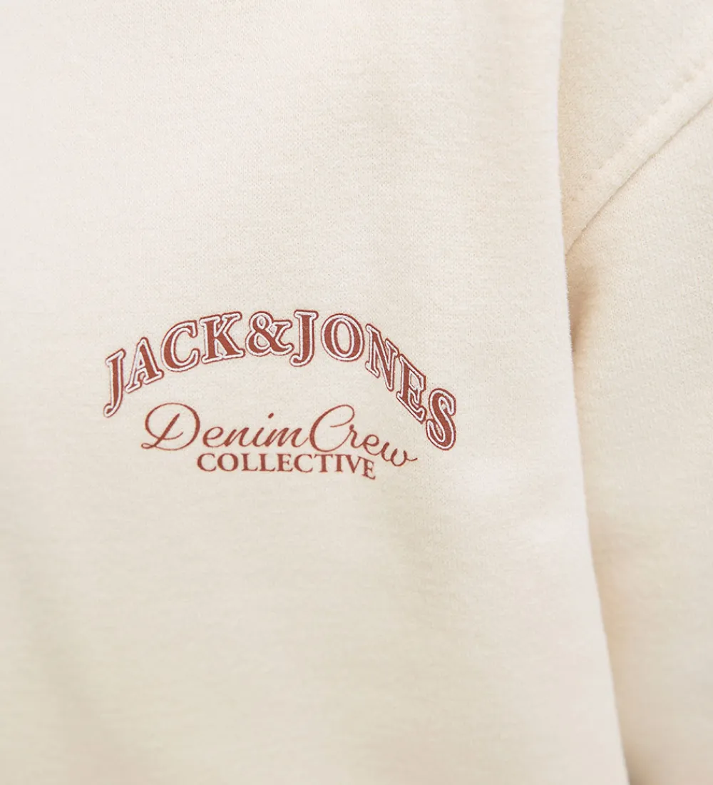 Elegant Jack & Jones hættetrøje i en blød, cremefarvet nuance. Hættetrøjen har et flot print på venstre bryst af Jack & Jones og teksten “Denim Crew Collective” i brun. Bagpå er der et stort matchende logoprint.