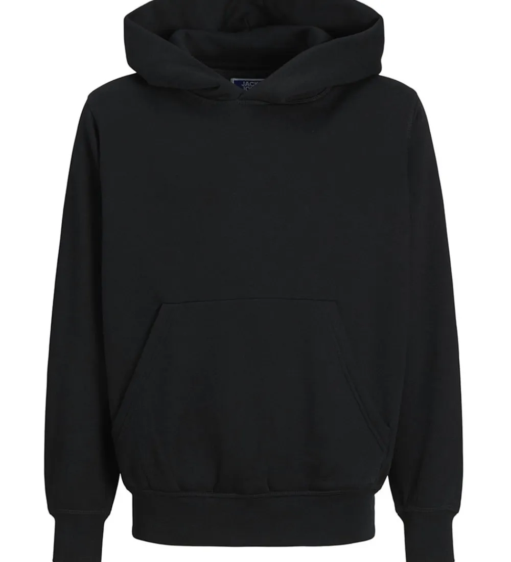 Smart Jack & Jones hættetrøje i sort. Jack & Jones hættetrøjen er lavet i en kraftig kvalitet med en blød hætte og lange ærmer. Den har brede ribkanter i ærme- og taljeåbning. Indvendigt er der blødt, børstet bomuld.