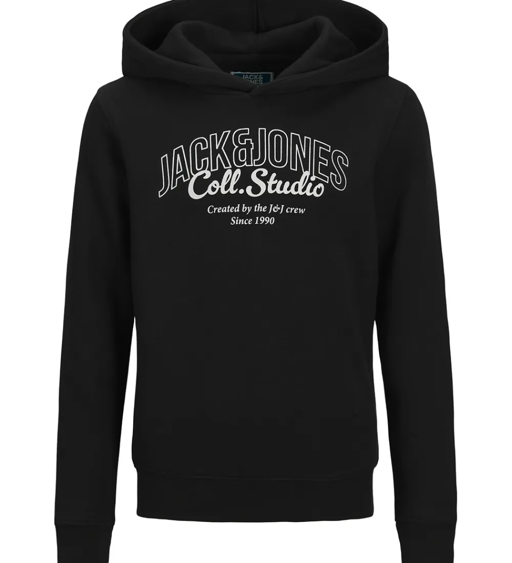 Stilfuld Jack & Jones hættetrøje i klassisk sort med et iøjnefaldende, hvidt tryk på brystet. Hættetrøjen har en praktisk og behagelig hætte, der giver ekstra varme og beskyttelse. Ribkanter ved ærmerne og i livet sikrer et godt fit.