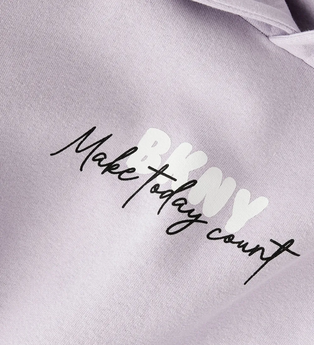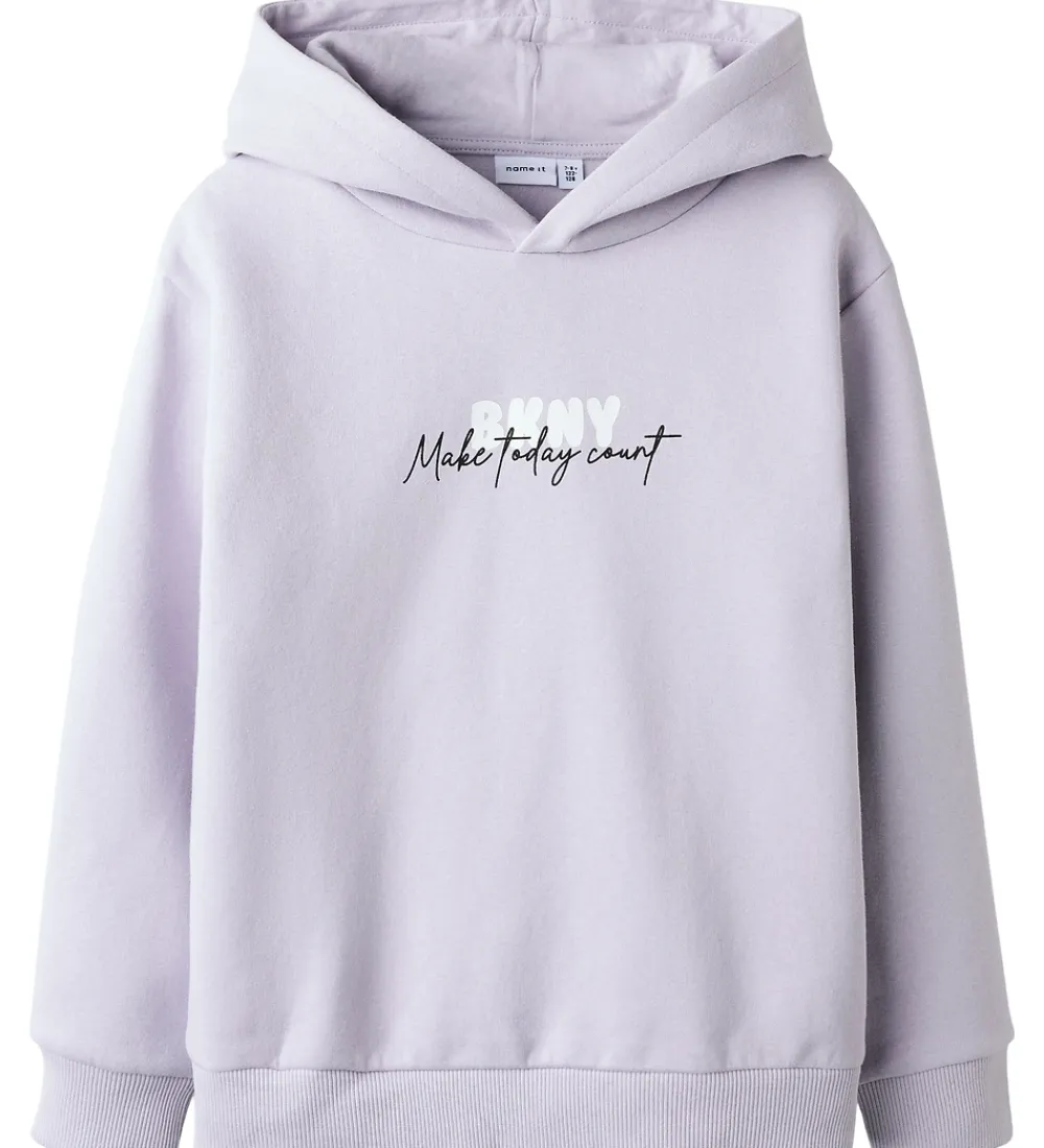 Stilfuld Name It hættetrøje i en lys lilla med teksten “Make today count” trykt på fronten i hvid og sort.