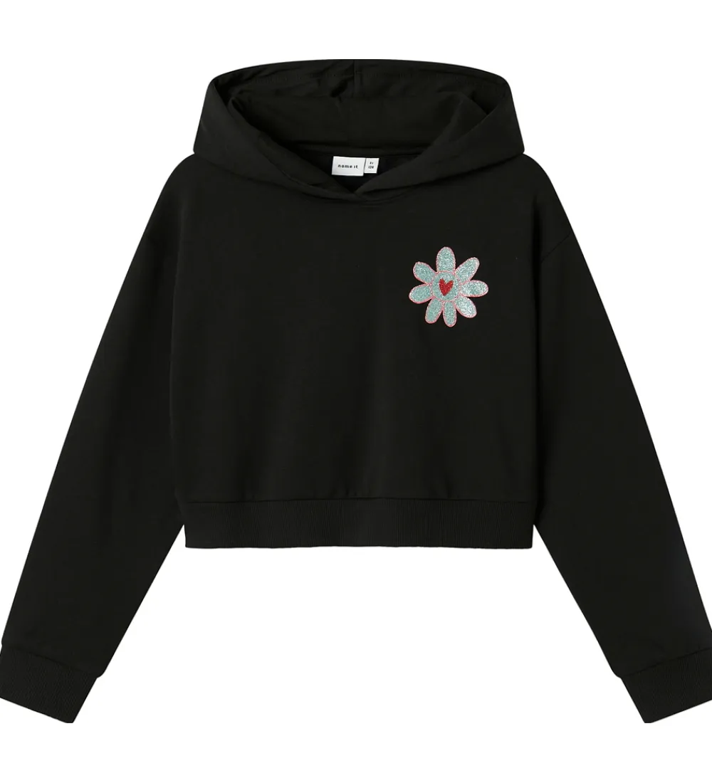 Stilfuld Name It hættetrøje i sort med et glimmerprint på venstre bryst af en blomst i blå, rosa og rød. På ryggen er der et stort print i hvid, pink og blå nuancer med teksten “One Love” og blomster i glimmer.
