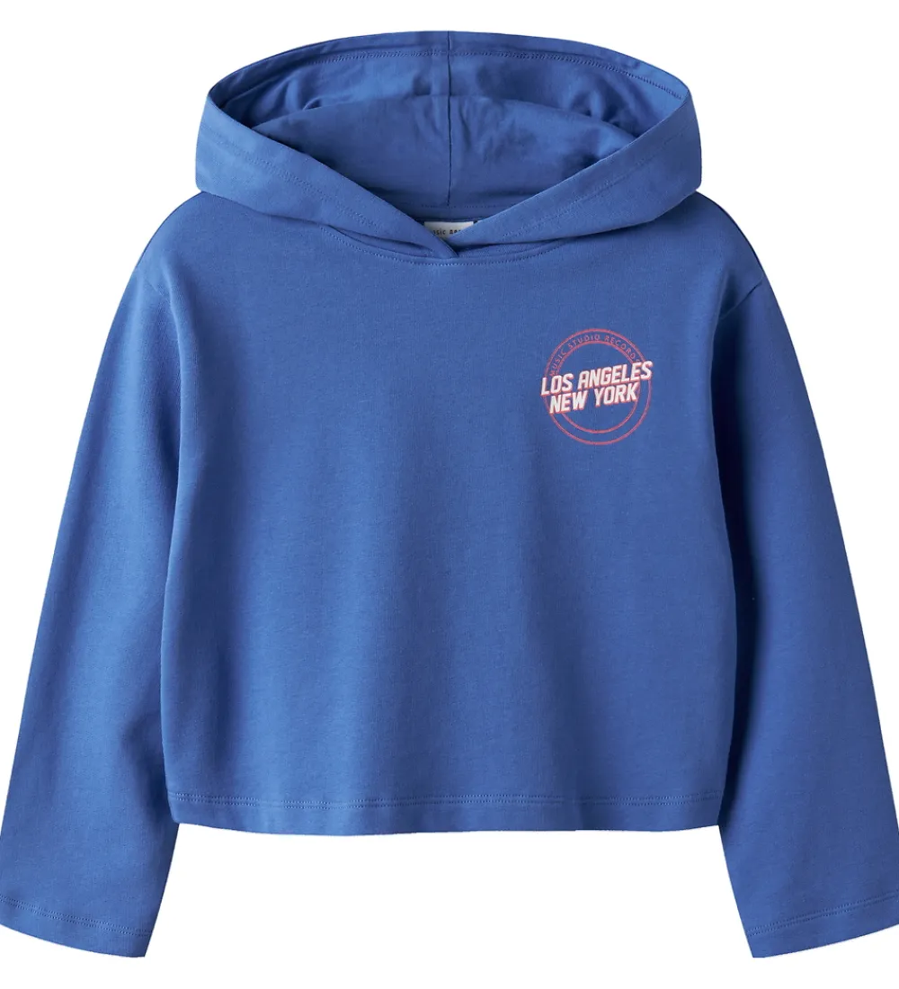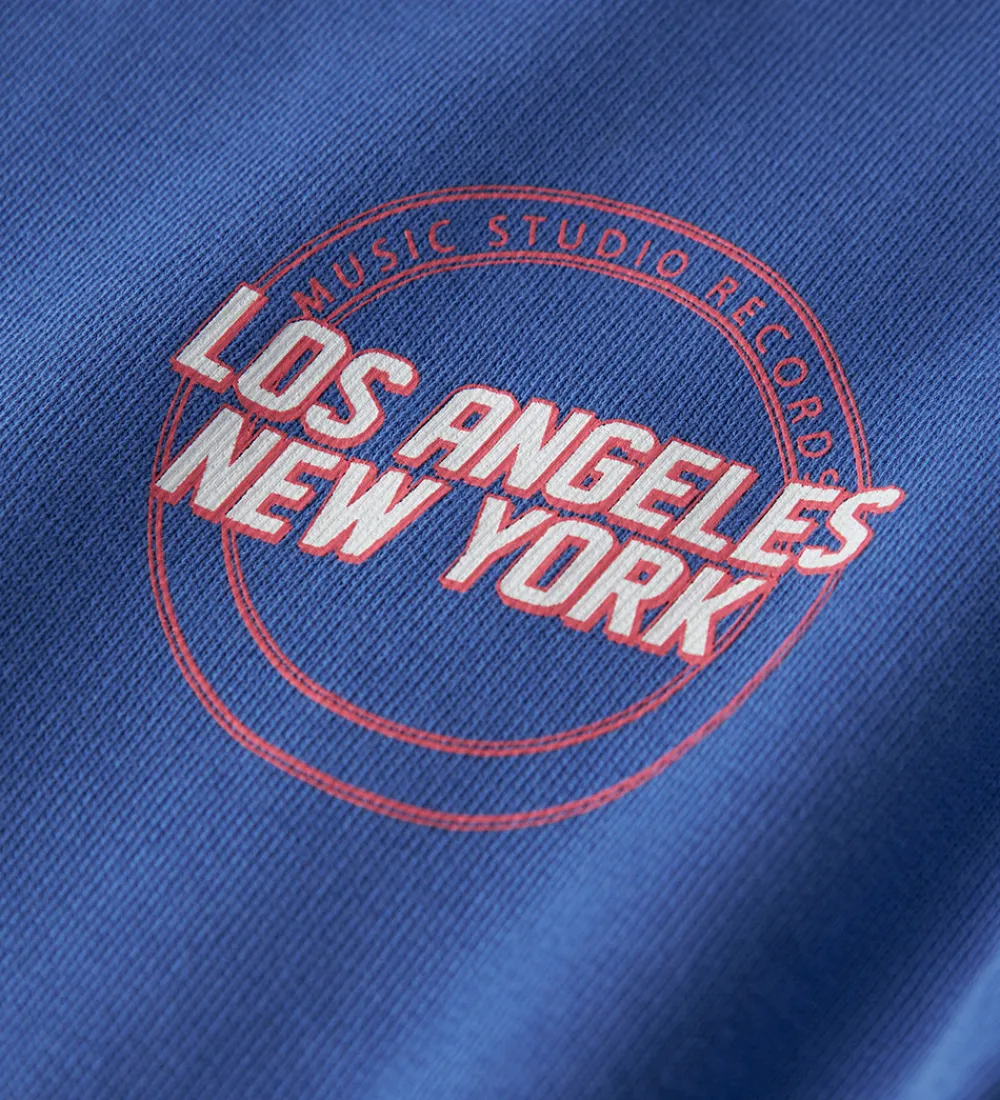 Stilfuld Name It hættetrøje i en klar blå farve. Hættetrøjen har et tryk på venstre bryst med teksten “Los Angeles New York” i hvid og rød foran en cirkelprint med “Music Studio Records” øverst.