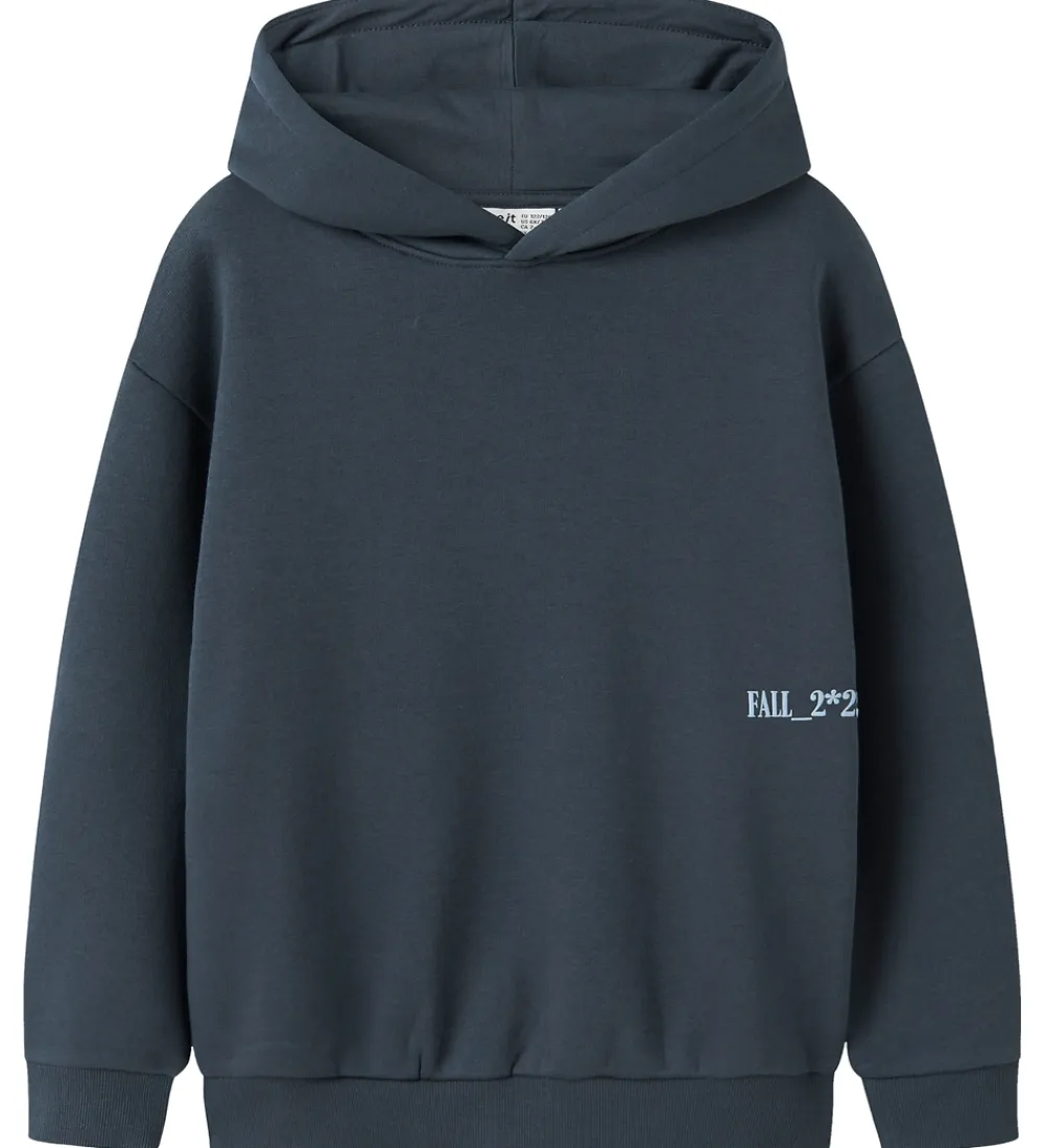 Stilren Name It hættetrøje i en dyb mørkeblå farve med teksten “Fall_2*25” i venstre side. På ryggen er der blåt tekstprint midt på ryggen og nederst. Hættetrøjen har en blød hætte og lange ærmer. Den har ribkanter i ærme- og taljeåbning, og indvendigt er der blødt, børstet bomuld.