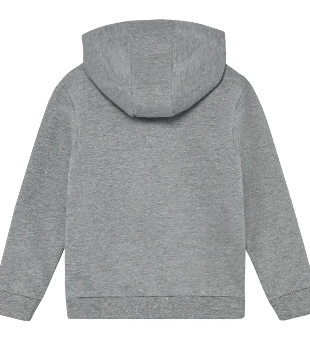 Smart hættetrøje fra Minymo i en meleret grå. Hættetrøjen har et stort print af Pokémon-figuren Pikachu på fronten. Hættetrøjen har ribkanter ved håndleddene og forneden. Den er udstyret med en praktisk hætte, der giver den et moderne udtryk.