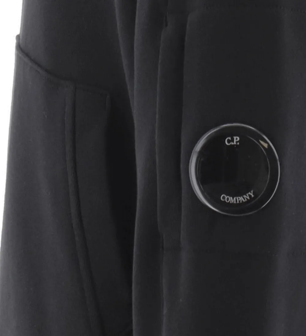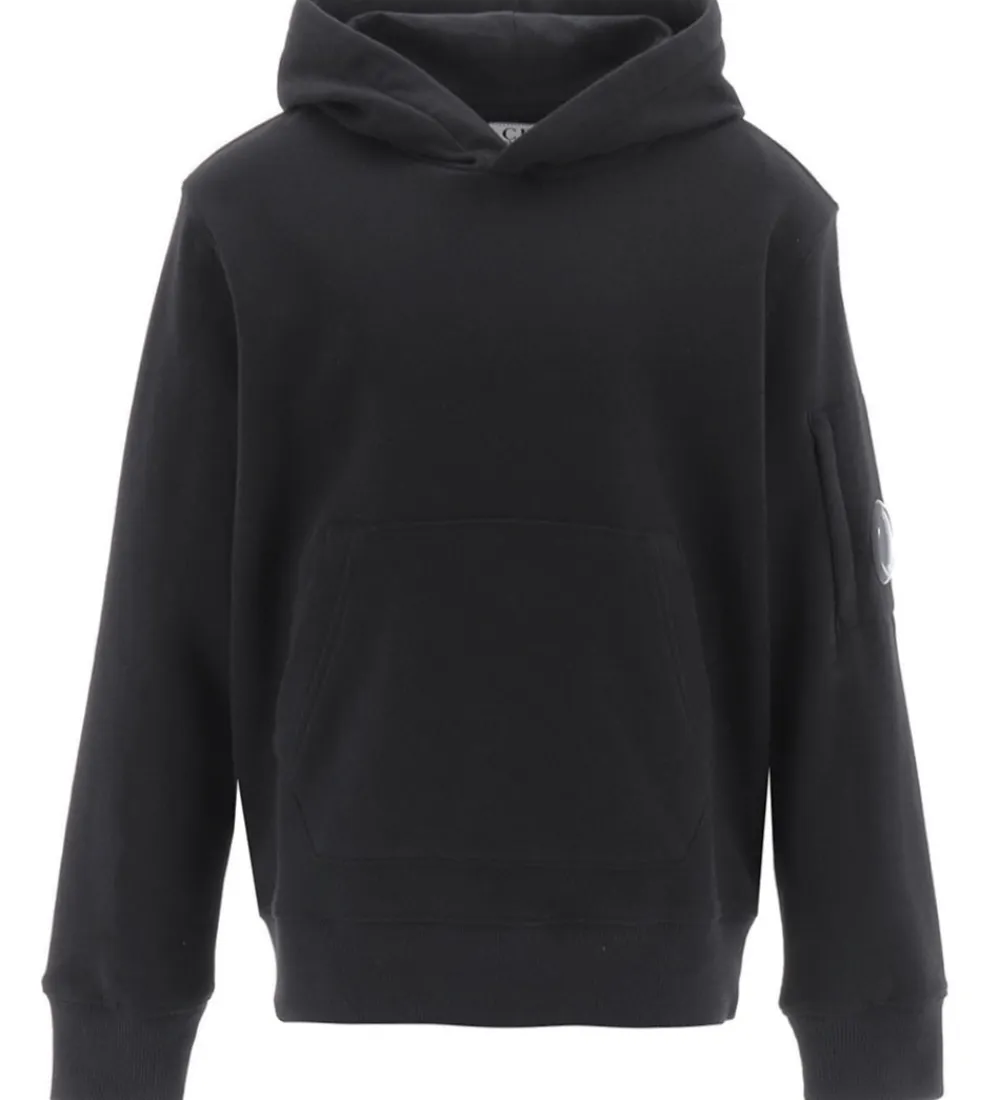 Lækker C.P. Company hættetrøje i ensfarvet sort sweat. Øverst på venstre ærme sidder der et sort plastiklogo.