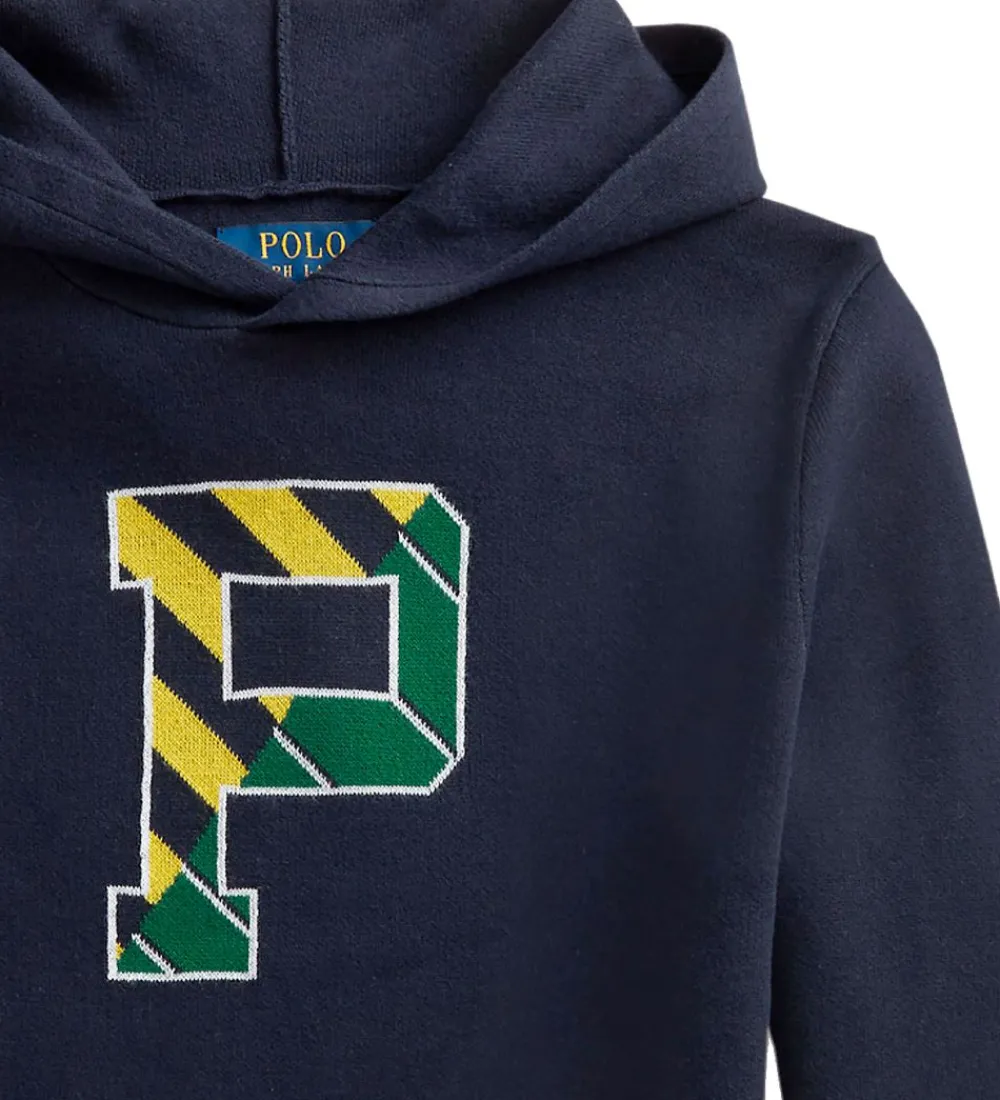 Lækker Polo Ralph Lauren hættetrøje i navy strik med et stort “P” fortil i gul og mørkegrøn.