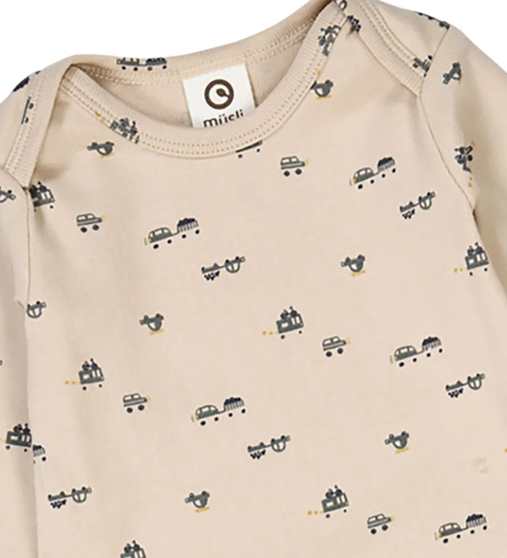 Elegant Müsli heldragt i en dæmpet beige farve med et diskret print af små biler og med en fin ribstruktur.