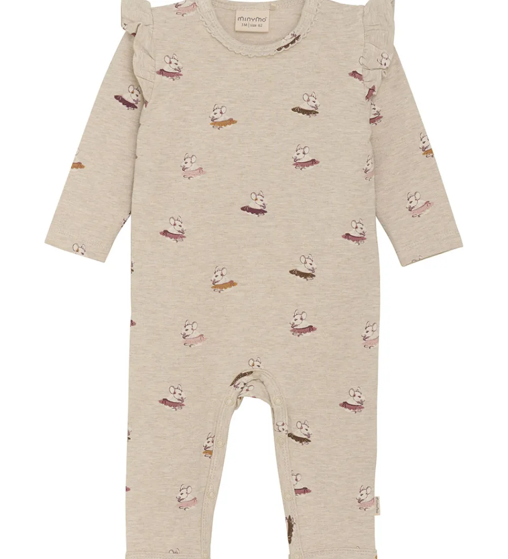 Denne skønne heldragt fra Minymo med lange ærmer er perfekt til leg og afslapning. Den er prydet med et dejligt print af små mus, der skaber en sjov og livlig stil. Minymo’s heldragt har fine flæser ved skuldrene, som tilføjer et sødt touch til dit barn’s outfit. Den komfortable pasform gør det til et ideelt valg til hverdagens eventyr.