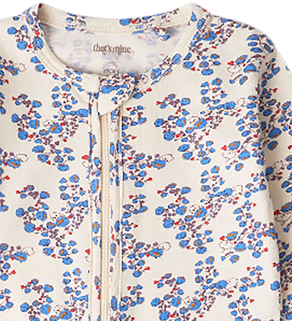Charmerende heldragt fra Thats Mine i cremehvid med et fint blomstermønster i blå og rosa nuancer.
