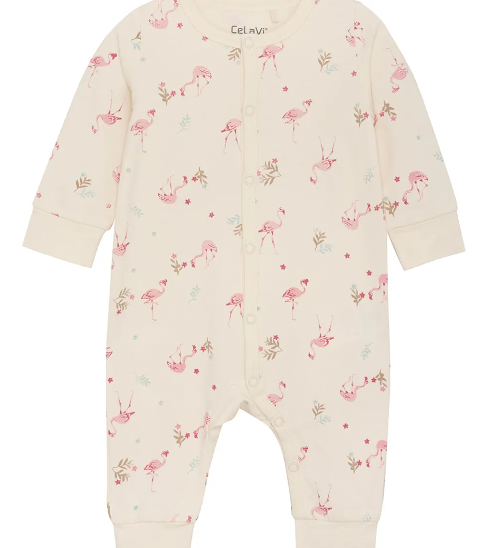 Skøn CeLaVi heldragt i cremehvid med et alloverprint af søde flamingoer og palmeblade i rosa, brune og grønne nuancer.