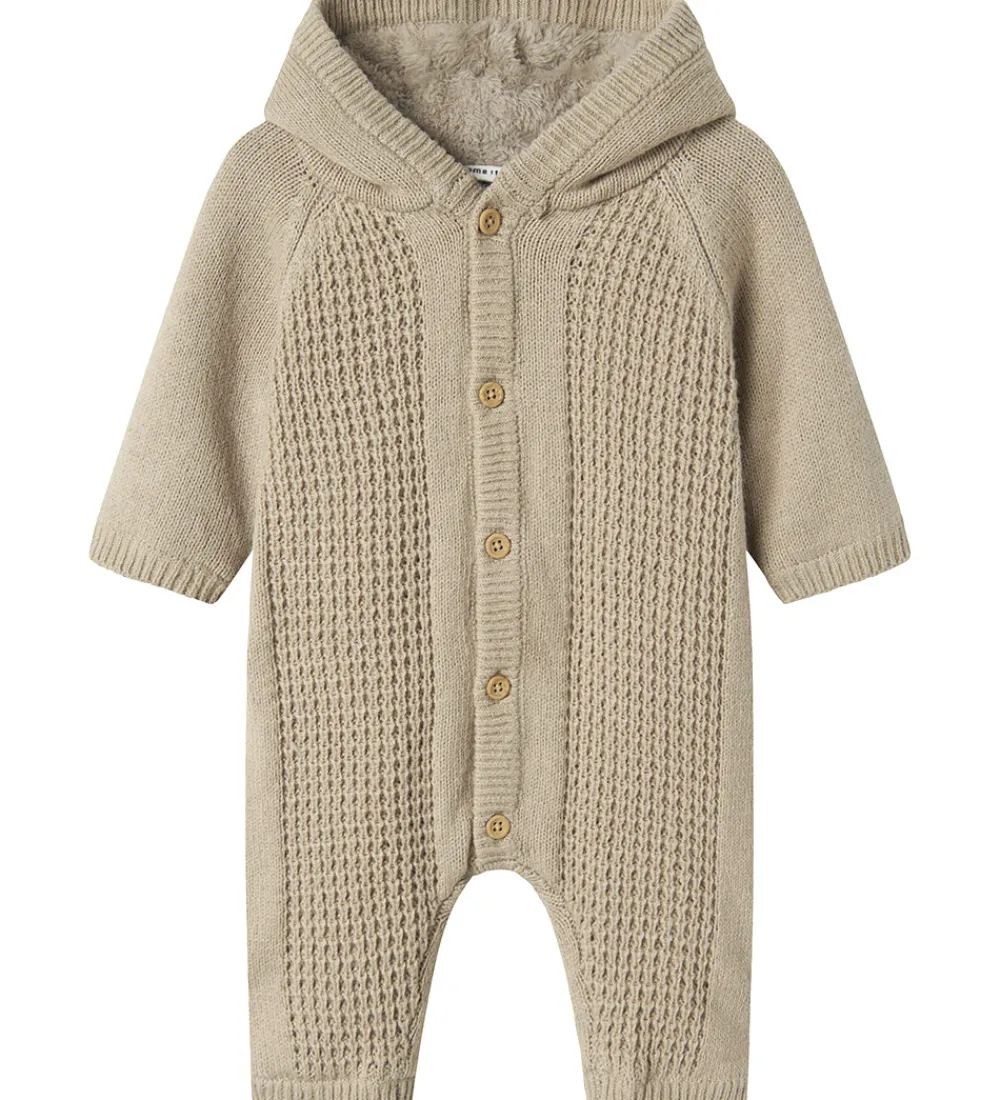 Behagelig Name It heldragt i beige strik med strukturstrik fortil. Heldragten er designet med lange ærmer og ben samt en praktisk hætte. Name It heldragten er udstyret med knapper langs fronten, der gør det nemt at åbne og lukke. Indvendigt er der blødt plysfor, som gør den ideel til kolde dage.