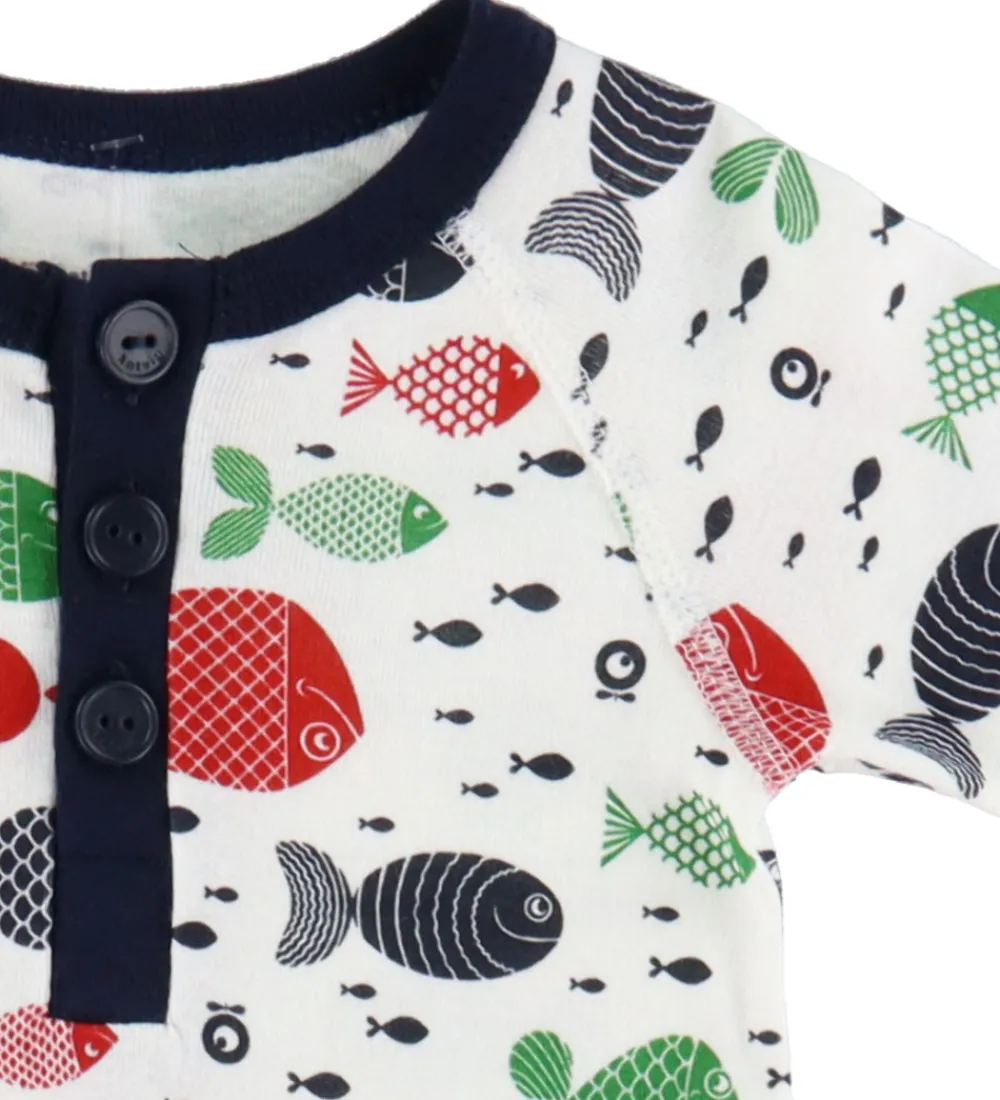 Skøn Katvig heldragt i hvid med et farverigt fiskeprint. Den har en rund halsudskæring med knaplukning fortil og lange ærmer. Heldragten lukkes med praktiske trykknapper mellem benene. Den har brede ribkanter i rød og navyblå.