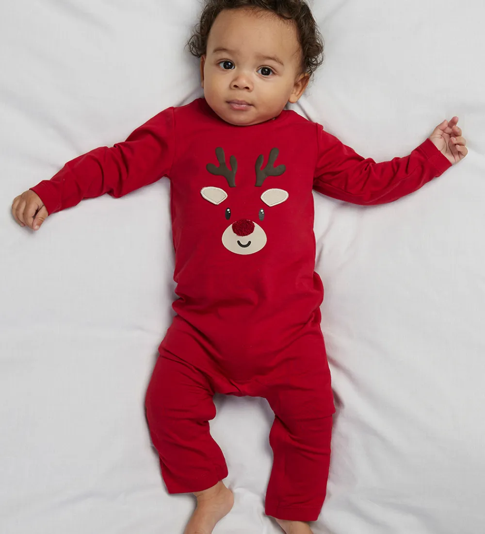 Charmerende Name It heldragt i en klar rød farve med en sød applikation af et rensdyrhoved på fronten. Heldragten har en rund halsudskæring med trykknapper ved venstre skulder og lange ærmer. Den lukkes mellem benene med trykknapper.