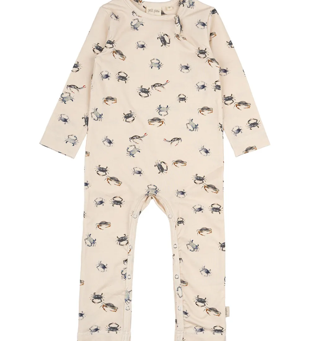 Lækker Petit Piao heldragt i beige med et alloverprint af krabber. Heldragten har lange ærmer og ben, og den åbnes med en trykknap ved venstre skulder, samt mellem benene.