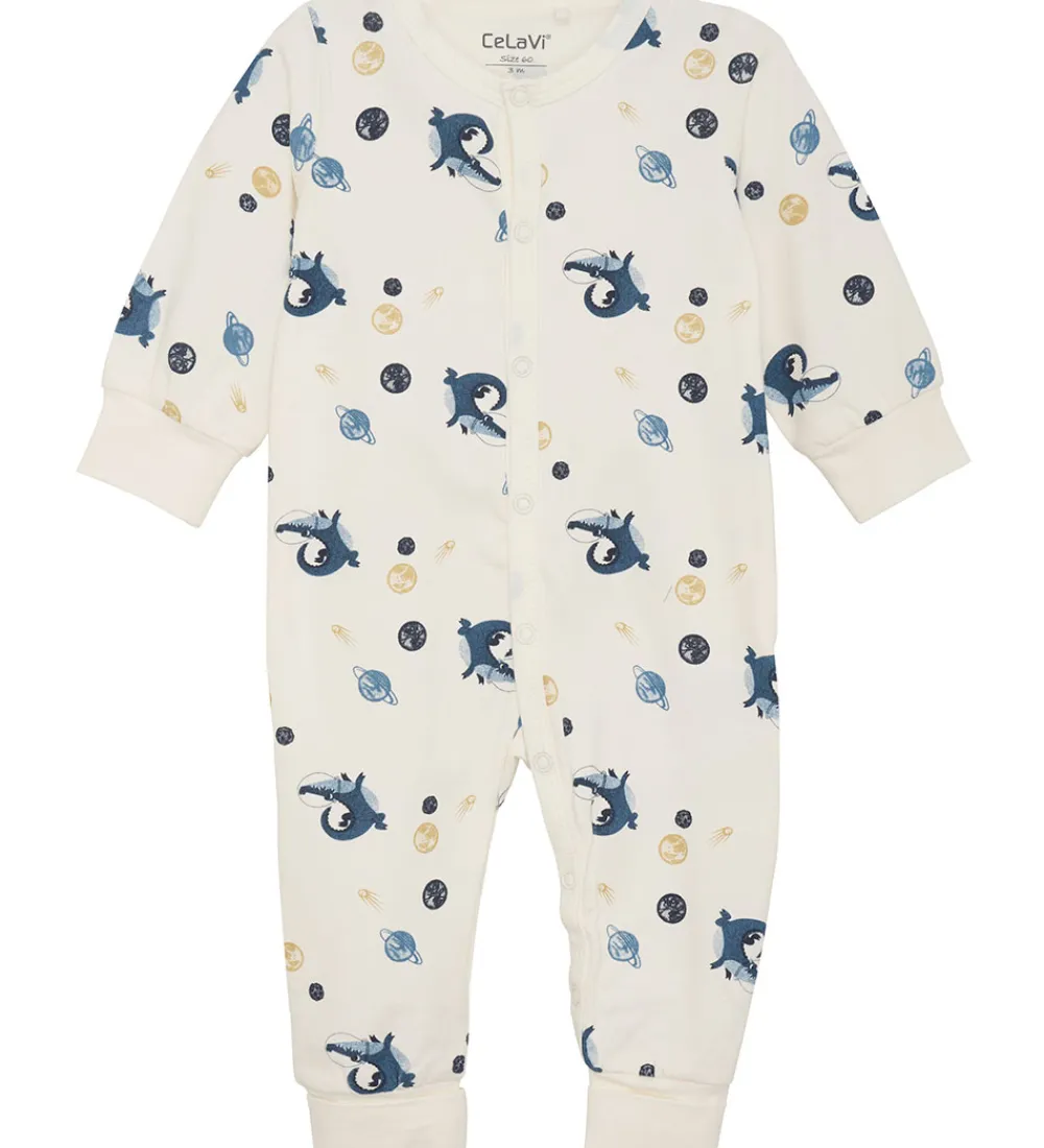Skøn CeLaVi heldragt i cremehvid med et allover print af krokodiller og planeter i blå og gul.