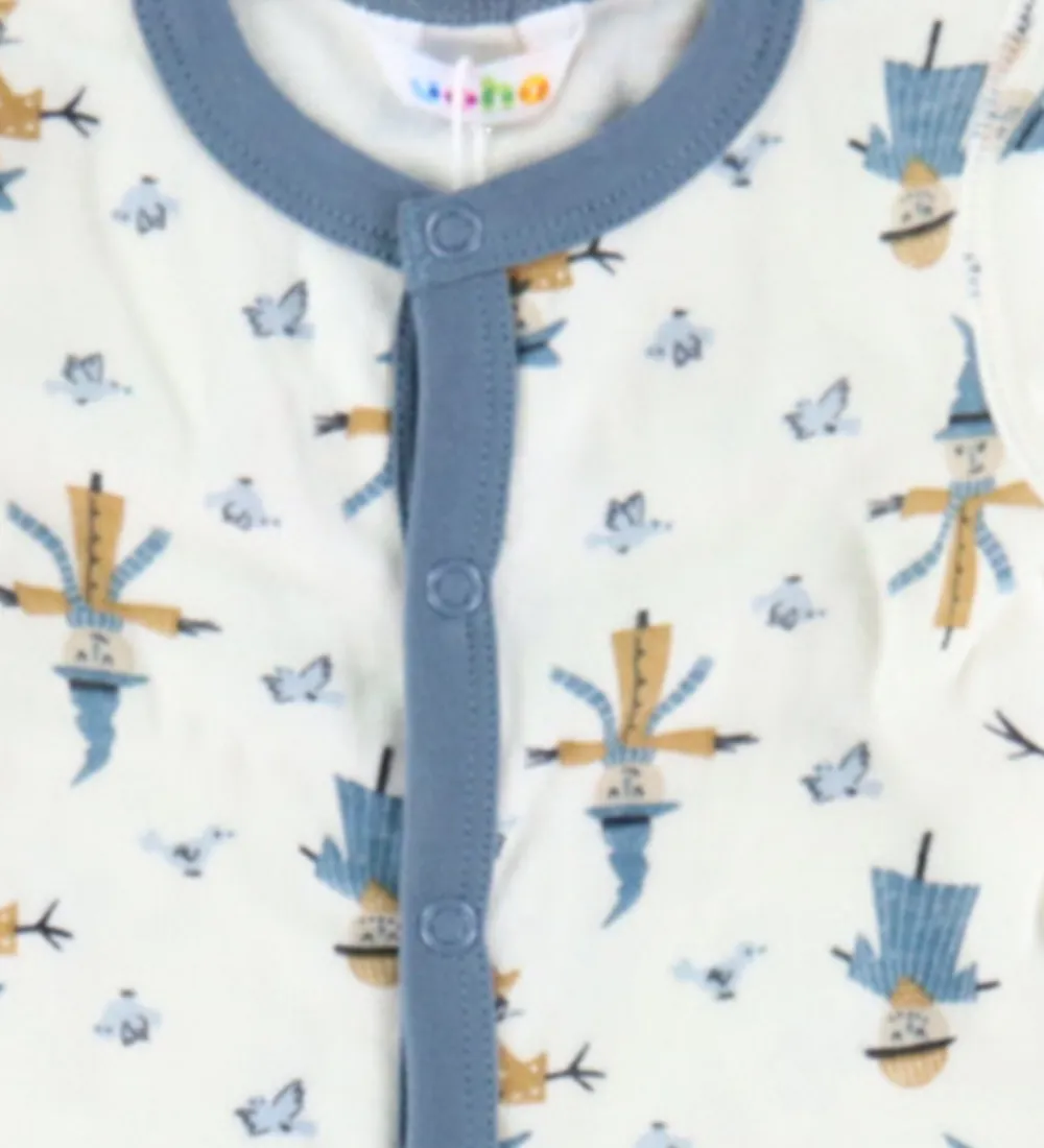 Dejlig Joha heldragt i off white, med blå kanter og forskellige fugleskræmsler i blå og brune nuancer.