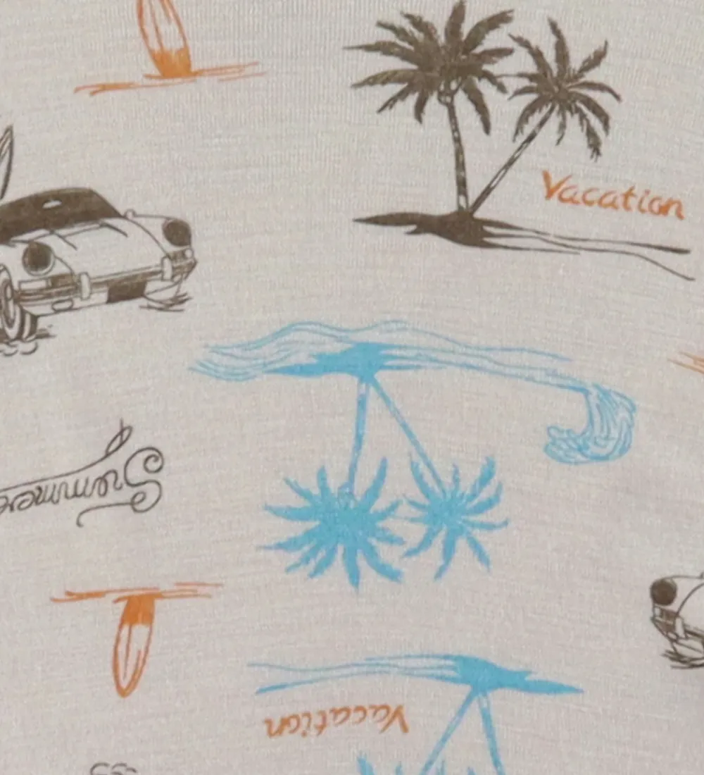 Smart Joha heldragt i en beige nuance med nydeligt bil- og palmeprint, der giver et legende udtryk. Heldragten har lange ærmer og knaplukning, hvilket gør den praktisk til hverdagsbrug.