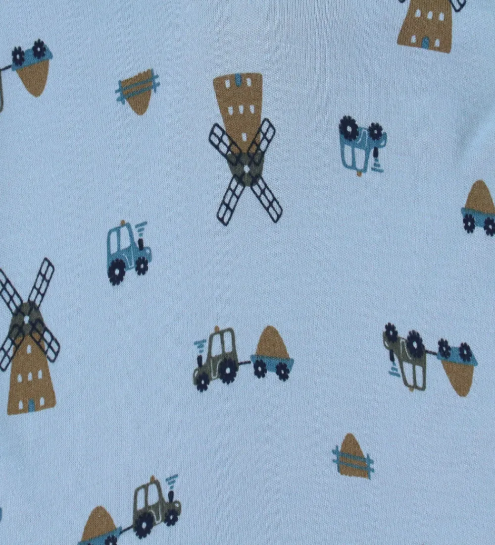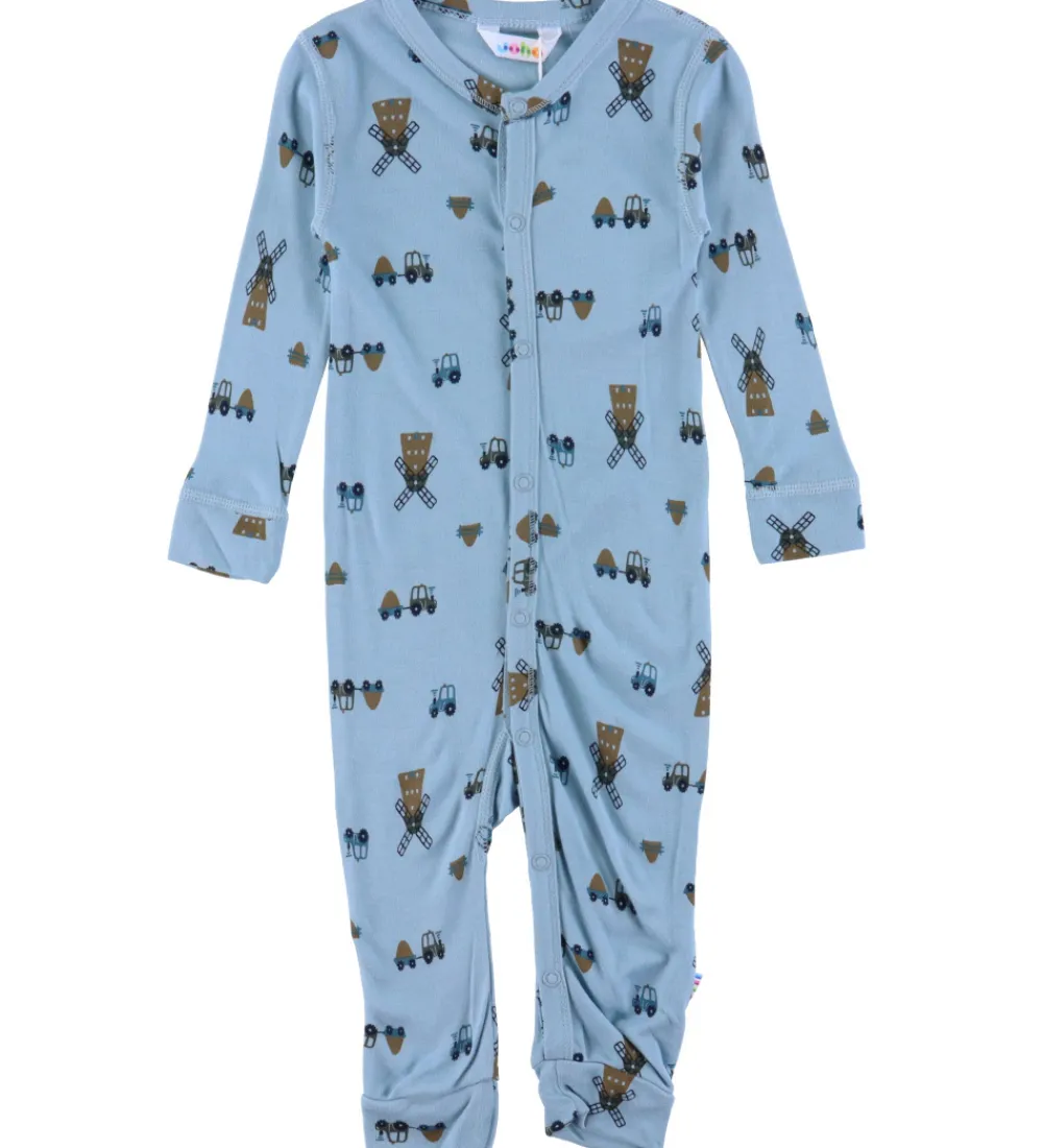 Smart Joha heldragt med lange ærmer i en lyseblå farve, prydet med et print af traktorer og vindmøller. Heldragten har trykknapper fortil fra halsen og ned langs venstre ben. Den har lange ben med fødder som kan foldes op.