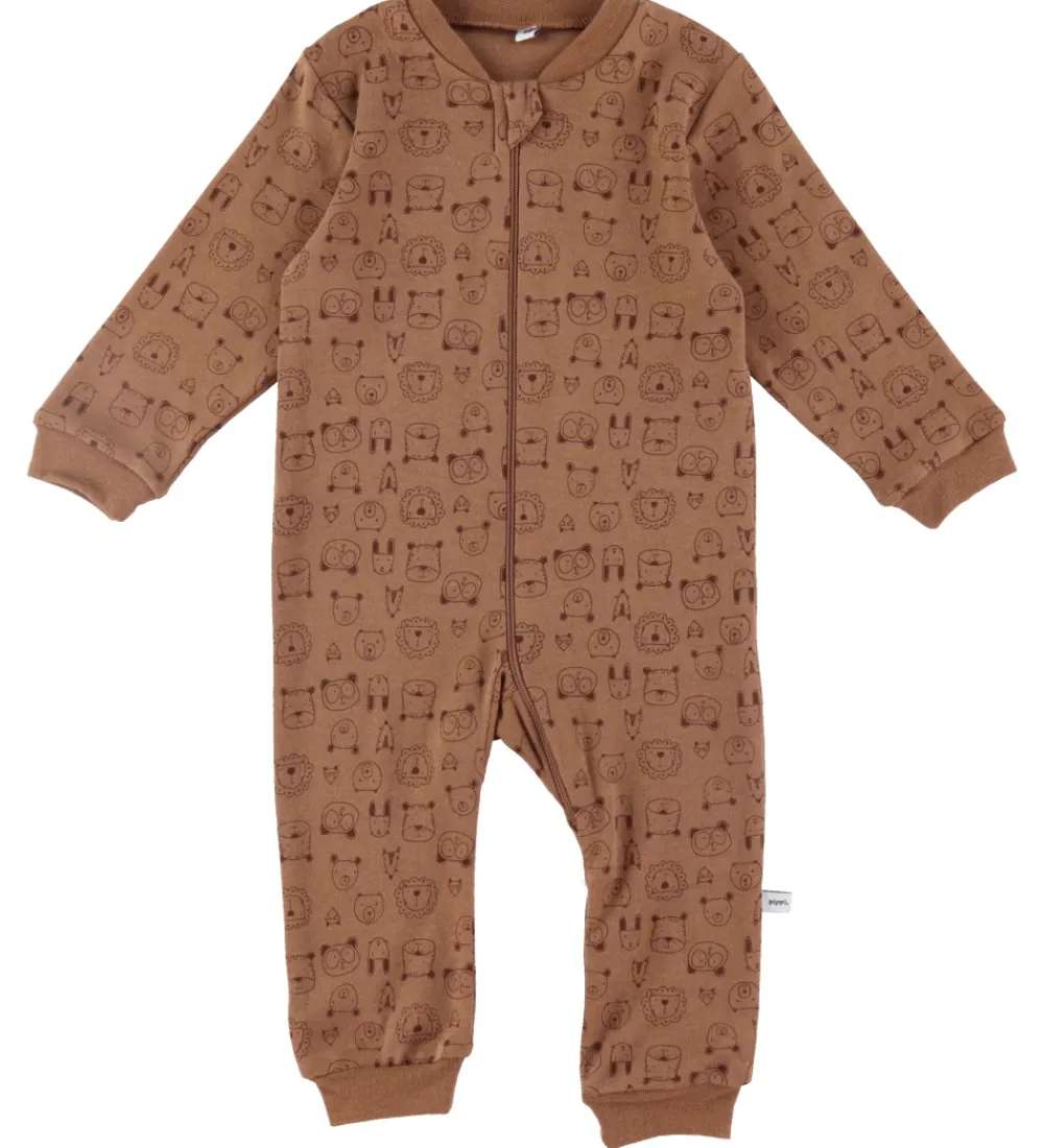 - Brun med et alloverprint af søde dyreansigter i brune nuancer