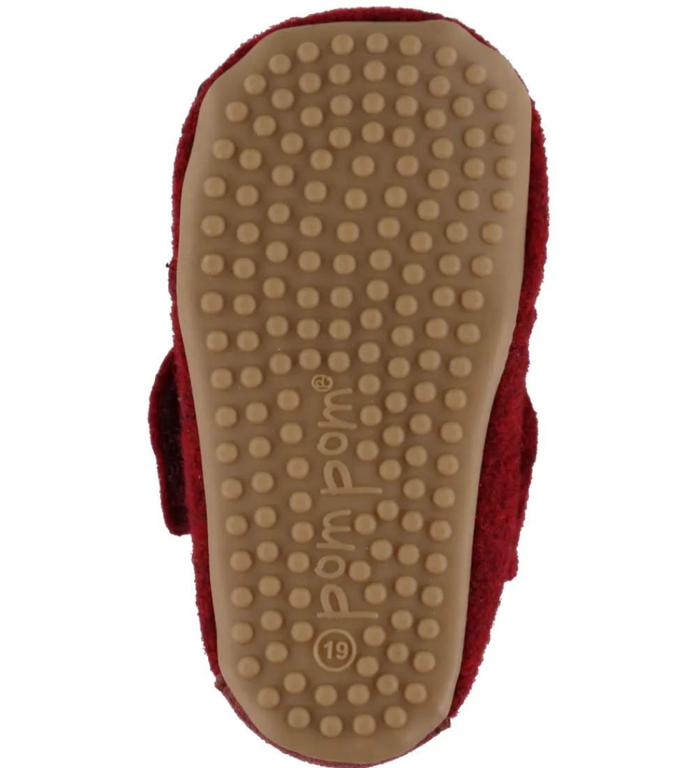 Fine Pom Pom hjemmesko i bordeauxrødt uld, med en fin detalje af rødt ruskind på hælen.