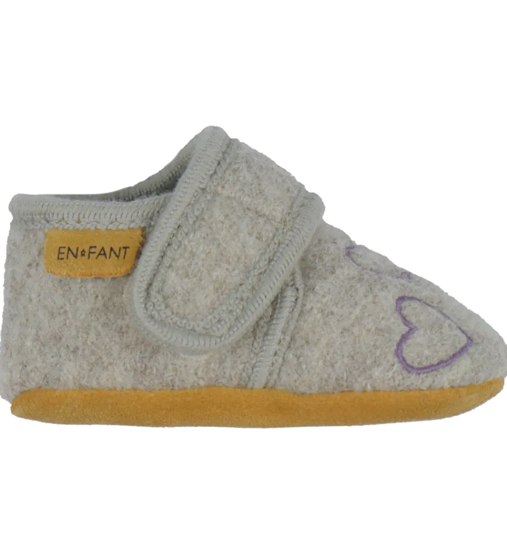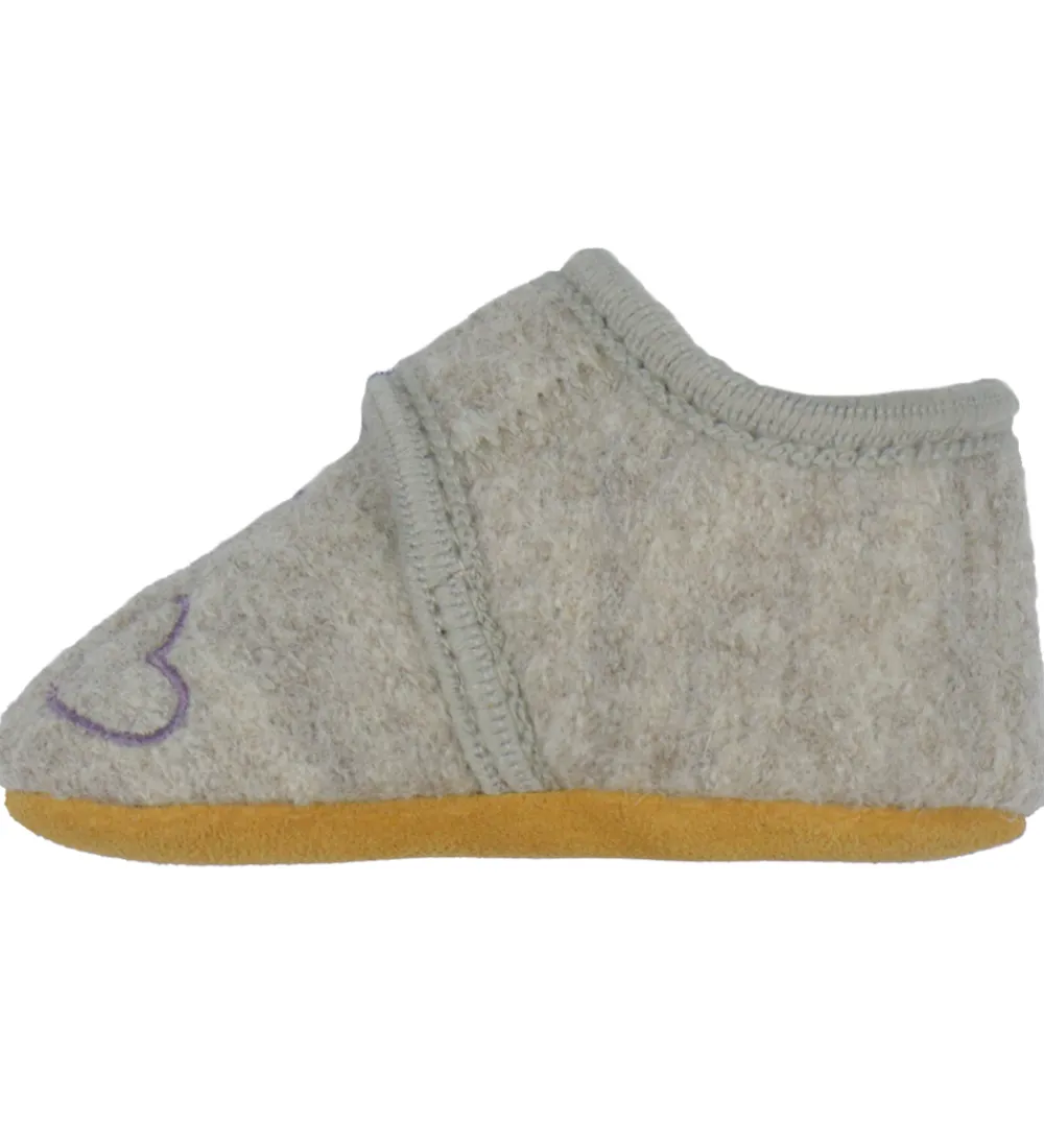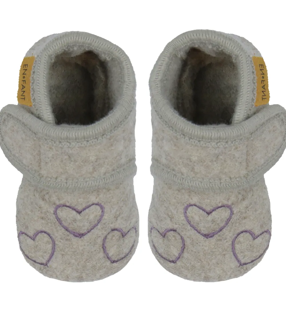 Fine En Fant hjemmesko i gråbeige uld med en broderede hjerter på foden.