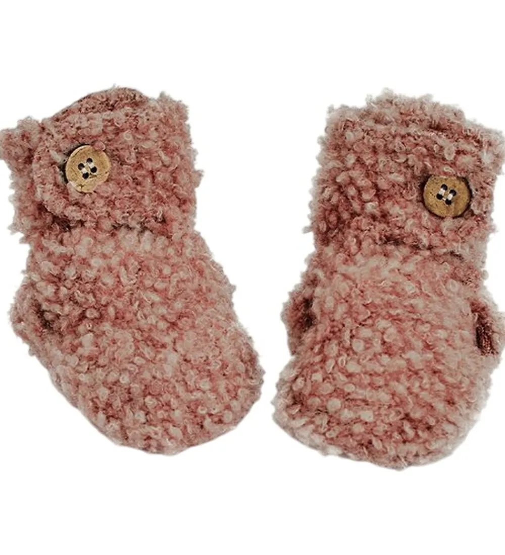 Lækre Smallstuff hjemmesko i rosa bouclé. Smallstuff hjemmeskoene har elastik omkring anklerne og en knap i toppen, som kan justeres, så hjemmeskoene sidder godt omkring benene. Hjemmeskoene er fremstillet af merinould og polyamid, som giver god varme i de kolde måneder.