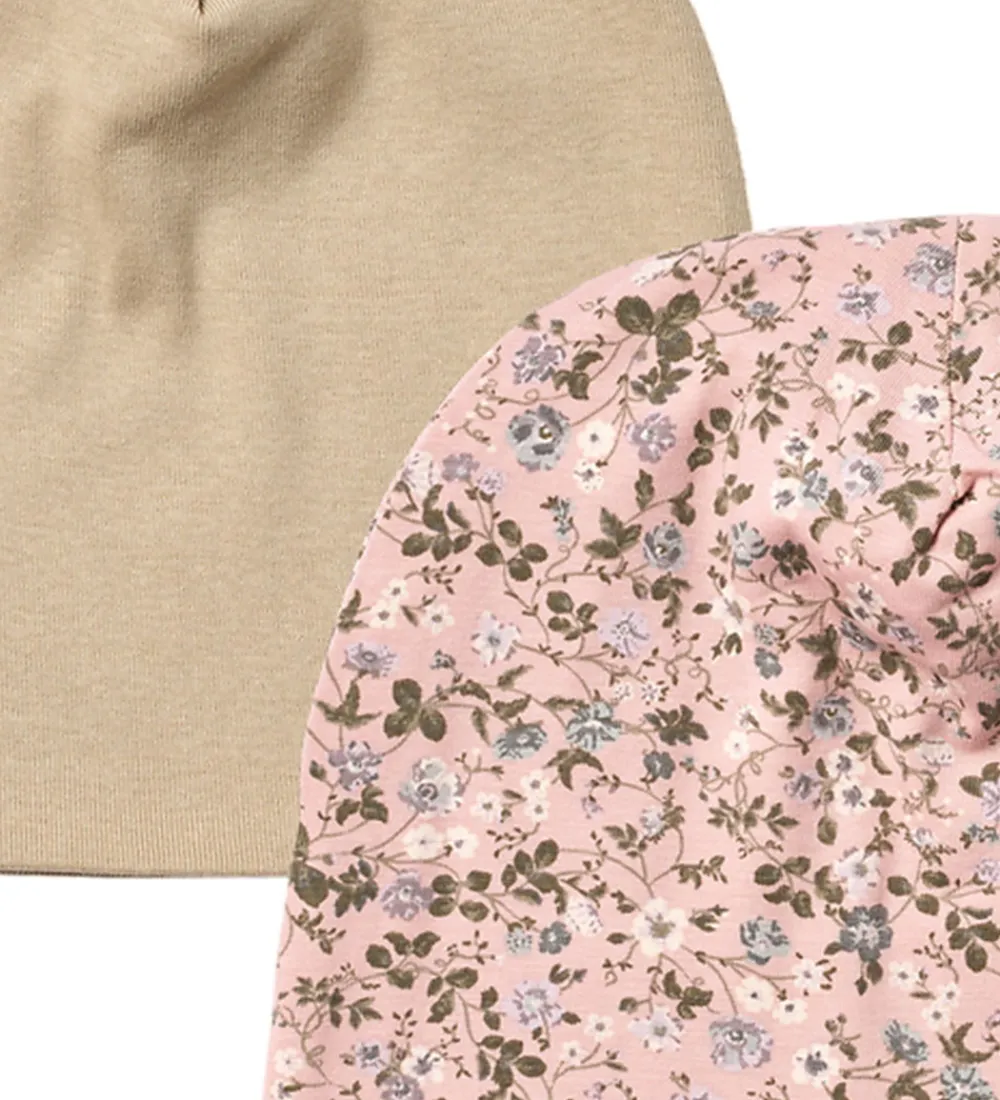 Flotte Wheat hueer solgt i en 2-pak med to designs. Den ene hue er i en enkel beige farve, mens den anden er dekoreret med et fint blomsterprint på en lyserød baggrund. Begge huer haren rund hovedform, og de består af to lag blødt bomuldsjersey. Wheat huerne bringer stil og funktion sammen på en elegant måde.