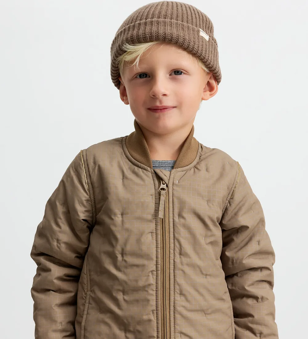 Lækker MarMar babyhue i ensfarvet brun i en strikket kvalitet med ribstruktur. Huen har en rund hovedform, og den har en bred kant med ombuk.