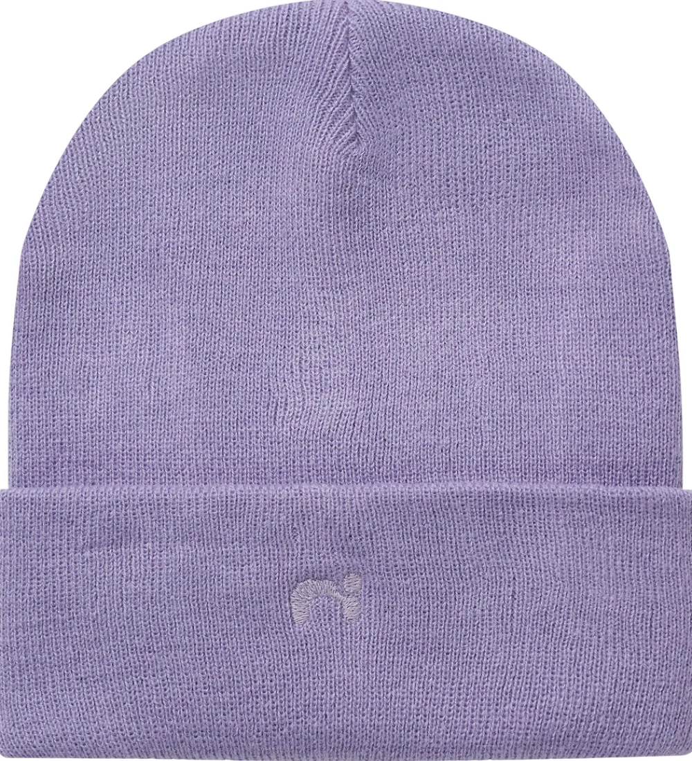 Fin Name It hue i lilla strik med et diskret, broderet logo på fronten. Huen består af to lag med vindblokering ved ørerne, som beskytter ørerne mod kold vind. Huen har en rund hovedform med et bredt ombuk nederst.