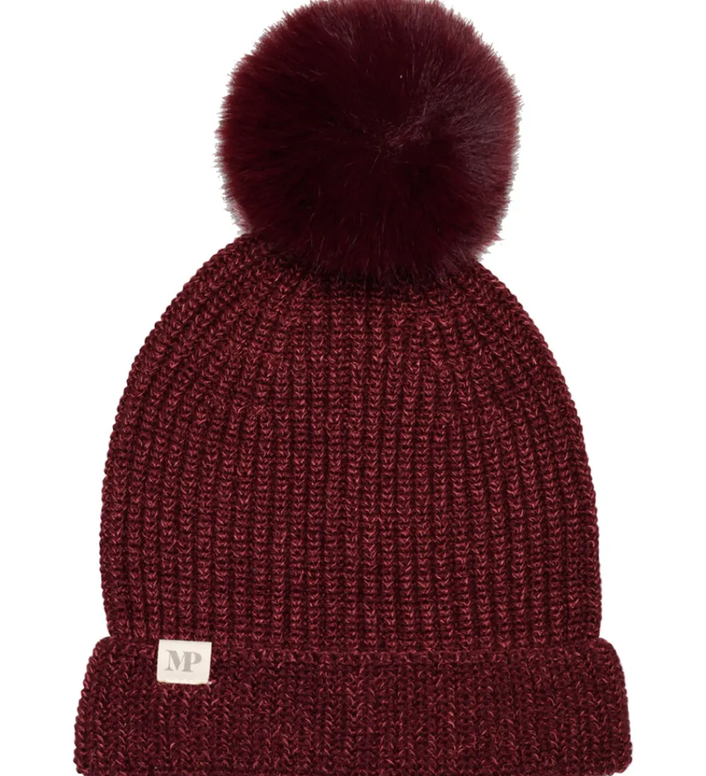 Flot MP hue i en dyb, bordeauxrød farve med en blød,ribstrikket struktur.