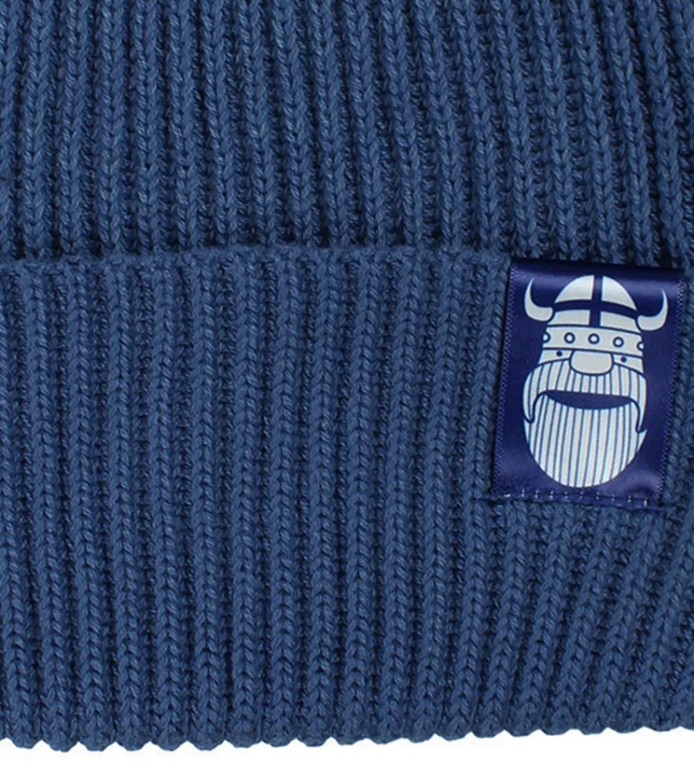 Flot Danefæ hue i en klassisk blå farve med en strikket ribstruktur over det hele. Huen har et opfoldet kant, hvor der sidder et lille mærke med et vikingemotiv. Danefæ har skabt en hue med et enkelt og stilrent design, der passer til mange forskellige anledninger.
