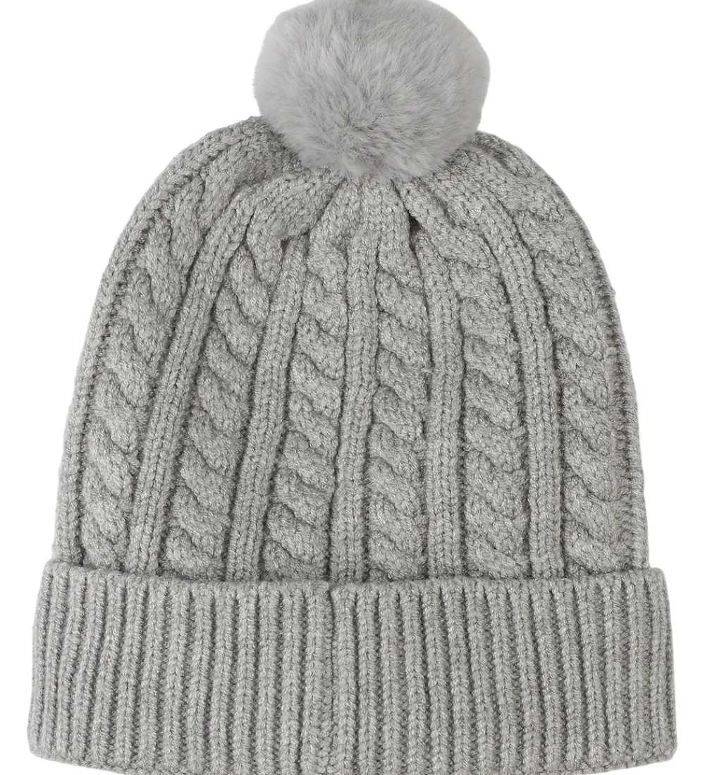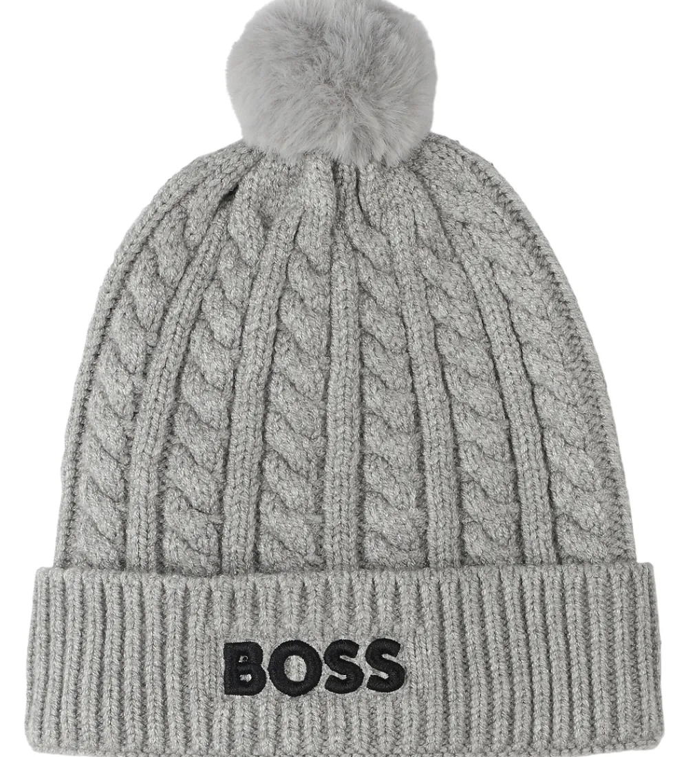 Skøn BOSS hue i meleret grå i en strikket kvalitet og med ribstruktur. Huen har en pompon på toppen, der tilføjer et stilfuldt præg. Fortil står der “Boss” broderet i sort. Huen har en spids form, og den består af et enkelt lag med et ombuk langs kanten.