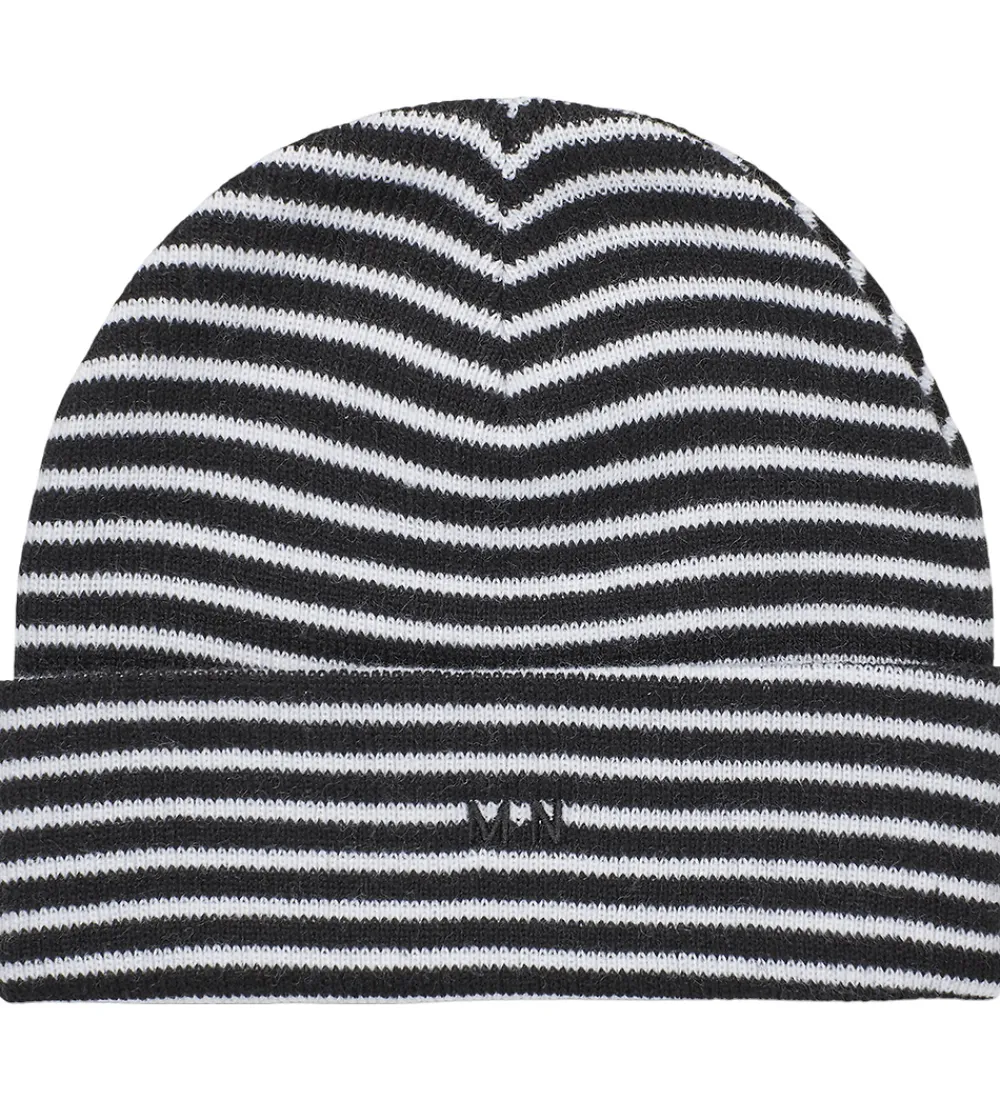 Flot Mads Nørgaard hue med vandrette striber i sort og hvid. Foran er bogstaverne “MN” broderet i sort. Huen har en strikket struktur og består af to lag. Den har en rund hovedform med et bredt ombuk nederst.