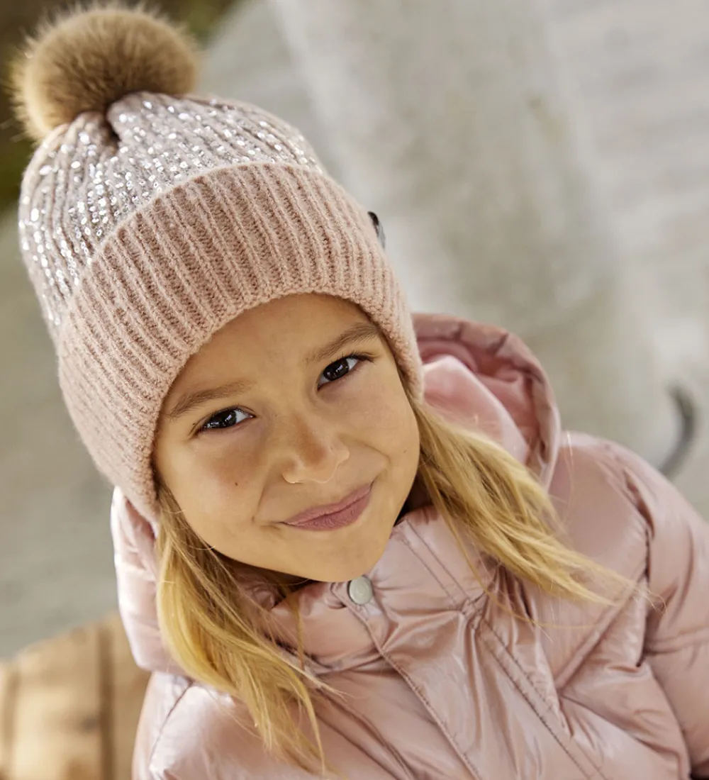 Lækker Minymo hue i rosa og med skinnende, sølvfarvede pailletter. Huen er strikket i en flot struktur og har en fin kvast på toppen i imiteret pels.