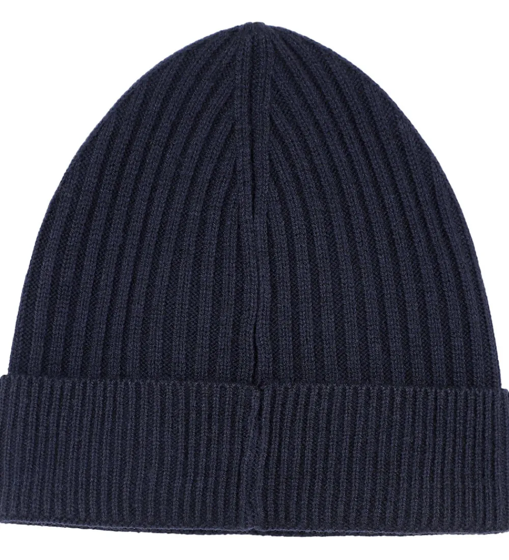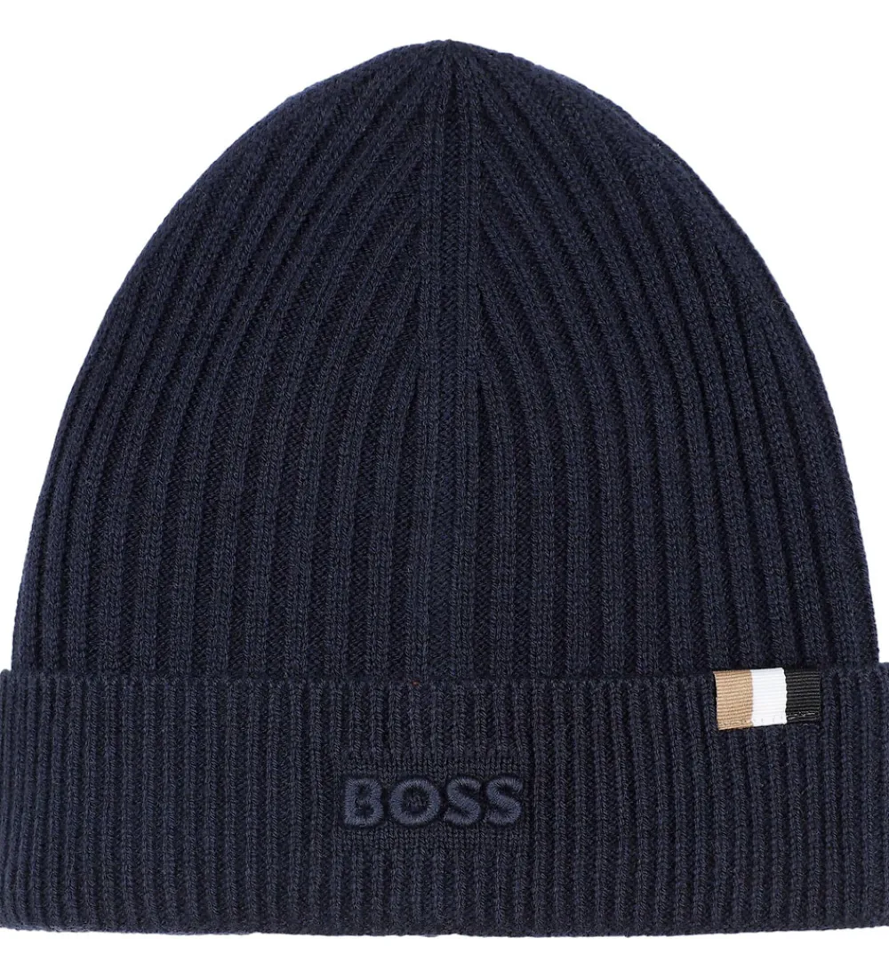 Fin BOSS hue i ensfarvet navy i en let strikket kvalitet med ribstruktur. Huen prydes af et diskret BOSS logo broderet på fronten. Huen har en rund hovedform og et bredt ombuk langs kanten.