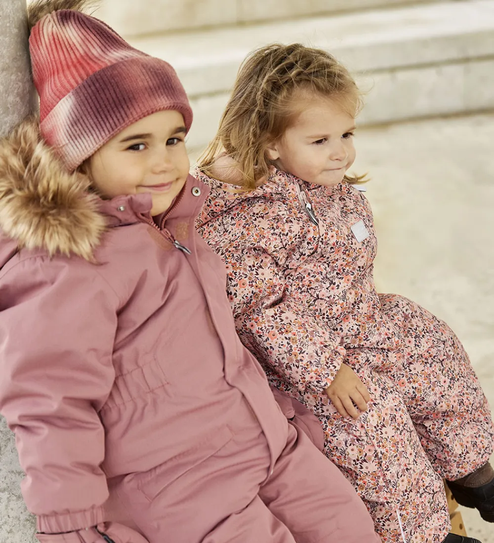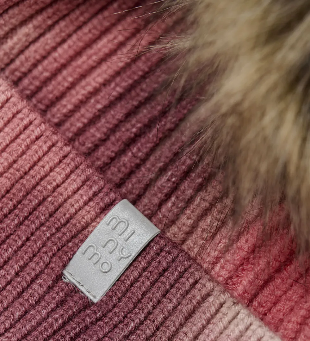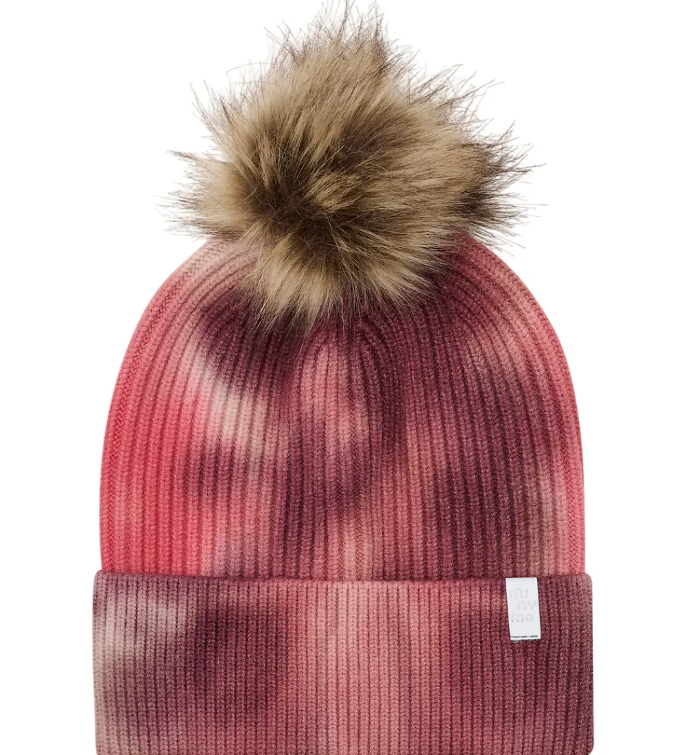 Lækker Minymo hue med tie-dye i rosa og lilla nuancer. Huen er i flot ribstrik og med en fin, aftagelig kvast på toppen i imiteret pels.