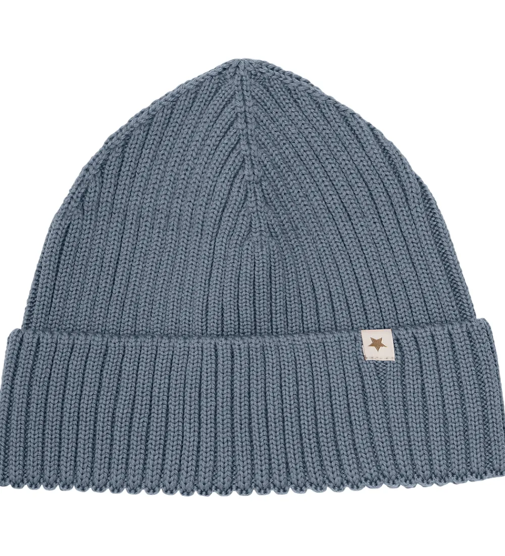 Elegant Huttelihut hue strikket i en flot, gråblå nuance. Huen har en blød ribstruktur, der giver et klassisk udtryk. Der er en dekorativ label foran, som tilføjer et stilfuldt element.