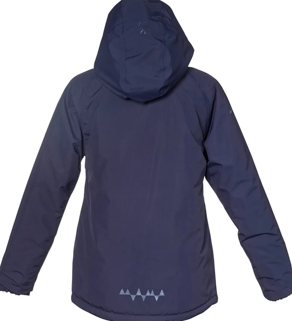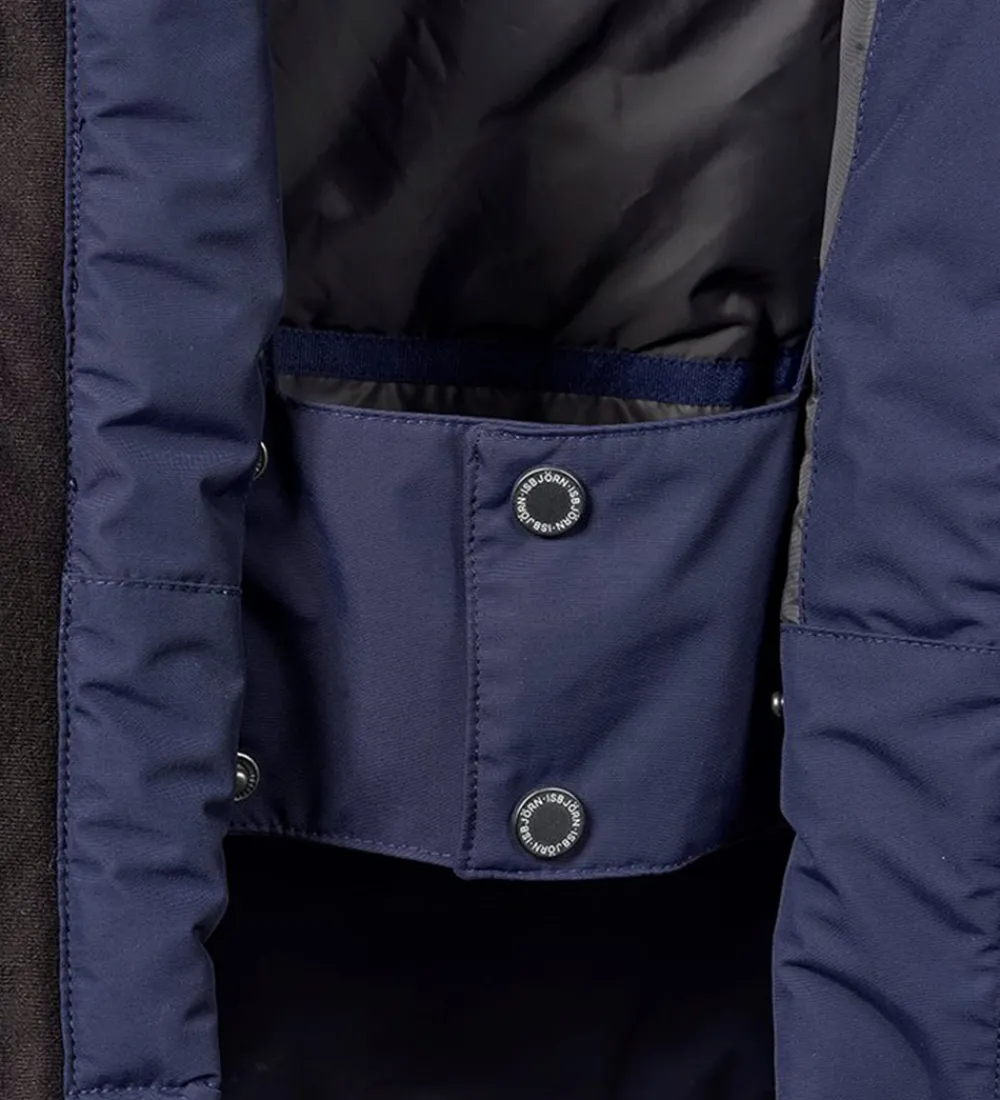 Flot Isbjörn Of Sweden vinterjakke i navyblå. Vinterjakken har grå logoprint på venstre bryst og hætten samt smarte refleksprint på lænden og højre skulder.