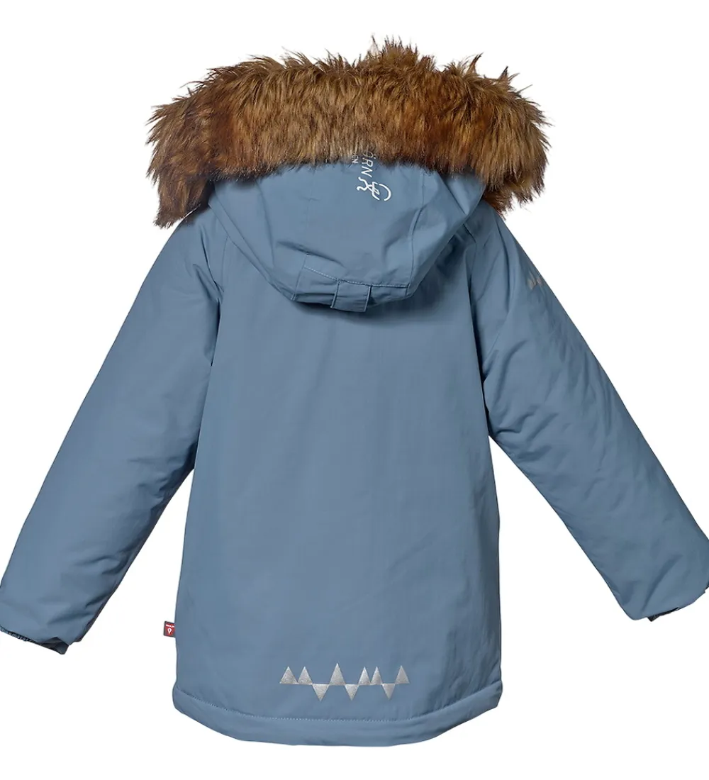 Lækker Isbjörn Of Sweden vinterjakke i støvet blå. Vinterjakken har hvide logoprint på venstre bryst og hætten samt smarte refleksprint på lænden og højre skulder.