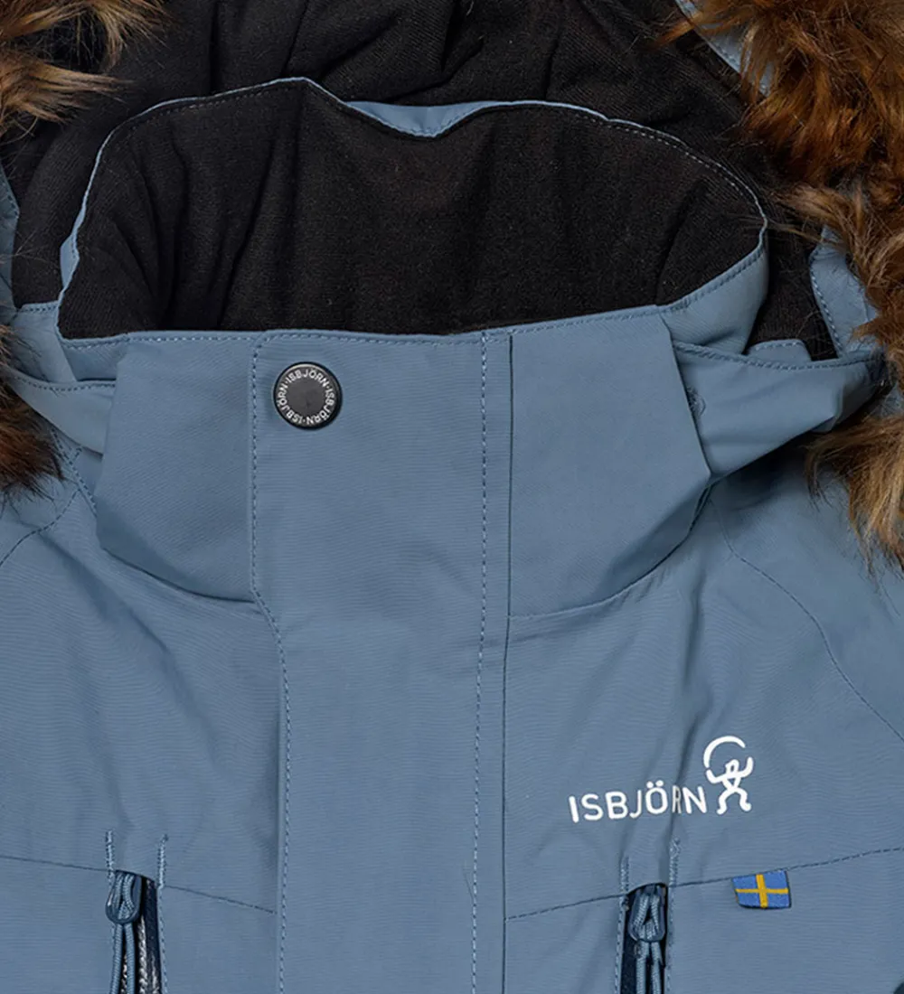 Isbjörn Of Sweden vinterjakken åbnes fortil ved hjælp af en lynlås med hagebeskytter og dobbelt vindstolpe, hvoraf den udvendige lukkes til med velcro og en trykknap i toppen. Hagebeskytteren og den indvendige vindstolpe er fleeceforede.